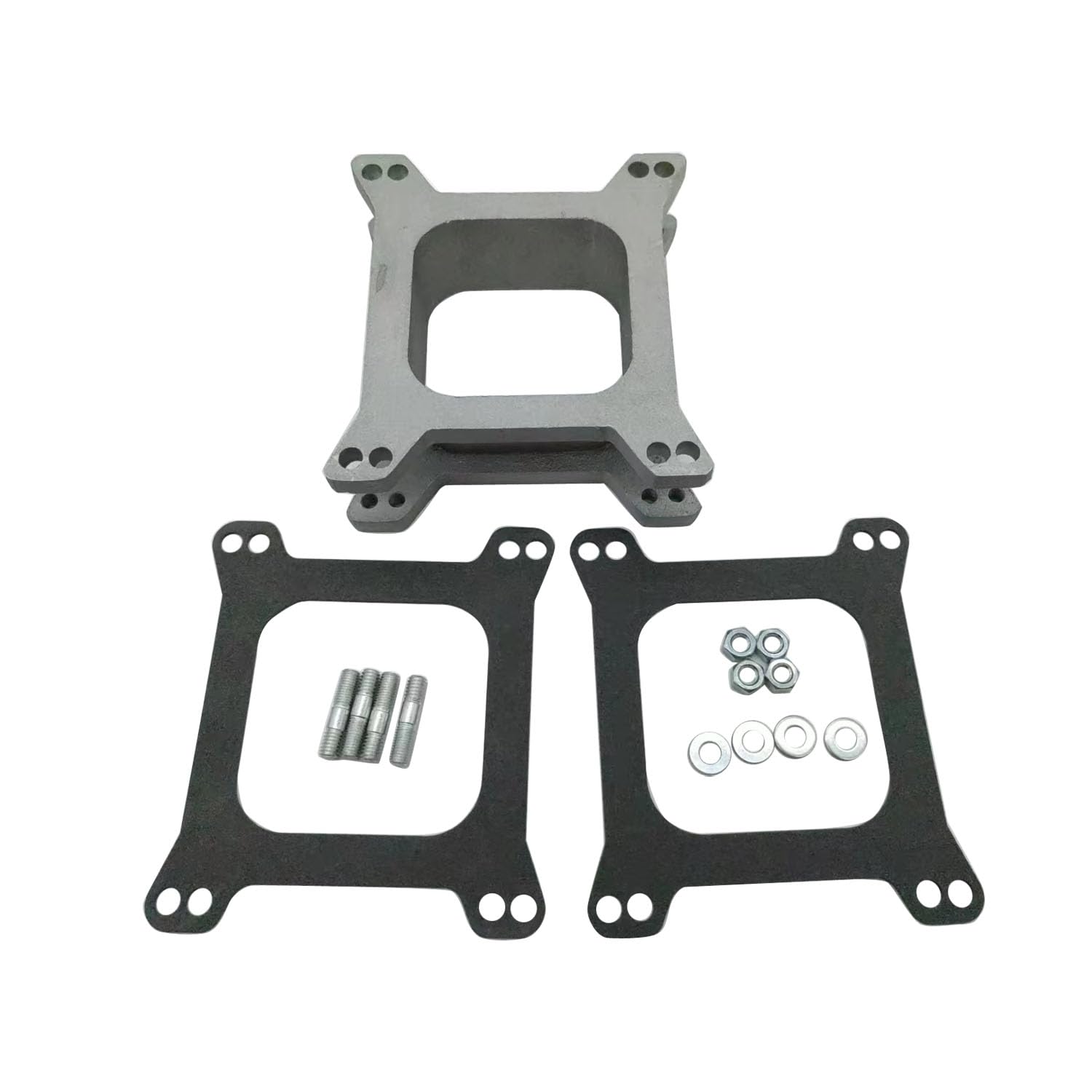 Fitment:Fits for 4150 and 4160 series Holley carbs;It fits most Holley and Edelbrock Carburetors that have a Square Bore.It will Not Fit Holley Spread Bore Carburetors or Quadra-jet Carburetors. Function:Plastic / Phenolic carburetor spacers reduce the fuel temperature inside the carburetor by insulating the carb from the hot intake manifold.This results in a denser air/fuel mixture for more power. Open design increases mid range torque compared to 4 hole style spacers. High quality material:Made of high quality aluminum material,which is corrosion resistance, high and low temperature resistance, anti-aging, long service life. Size:Thickness: 2" Complete accessories:Comes Complete As Pictured With Spacer,Bolts, Washers, Nuts. Specification: