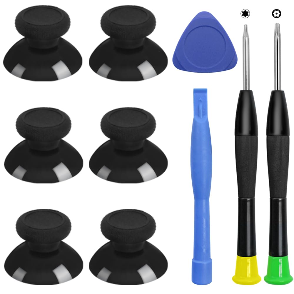 PACKAGE INCLUDES: 6PCS replacement thumbsticks, 1 x pry tool, 1 x triangle opening Picks and T6 T8 screwdriver repair parts. HIGH QUALITY: The controller thumbsticks are made of plastic and high quality rubber for enhanced grip, superior quality and suitable for long-term use. COMFORTABLE IN HAND: Our replacement thumbsticks set is hard-wearing, durable, comfortable in hand, impact resistant and unbreakable, enhance your gaming experience. PERFECT SET: Comes with a full set of tools to help you easily open the case and replace damaged controller sticks so you don't have to spend money on new controllers! BEST GIFT: This thumbstick replacement kit is perfect for gamepad players, a unique gift for every gamepad loving friend or family member around you. If you are not satisfied with the product or there is any issue with the product, please contact with us and we will solve it for you. PACKAGE INCLUDES: