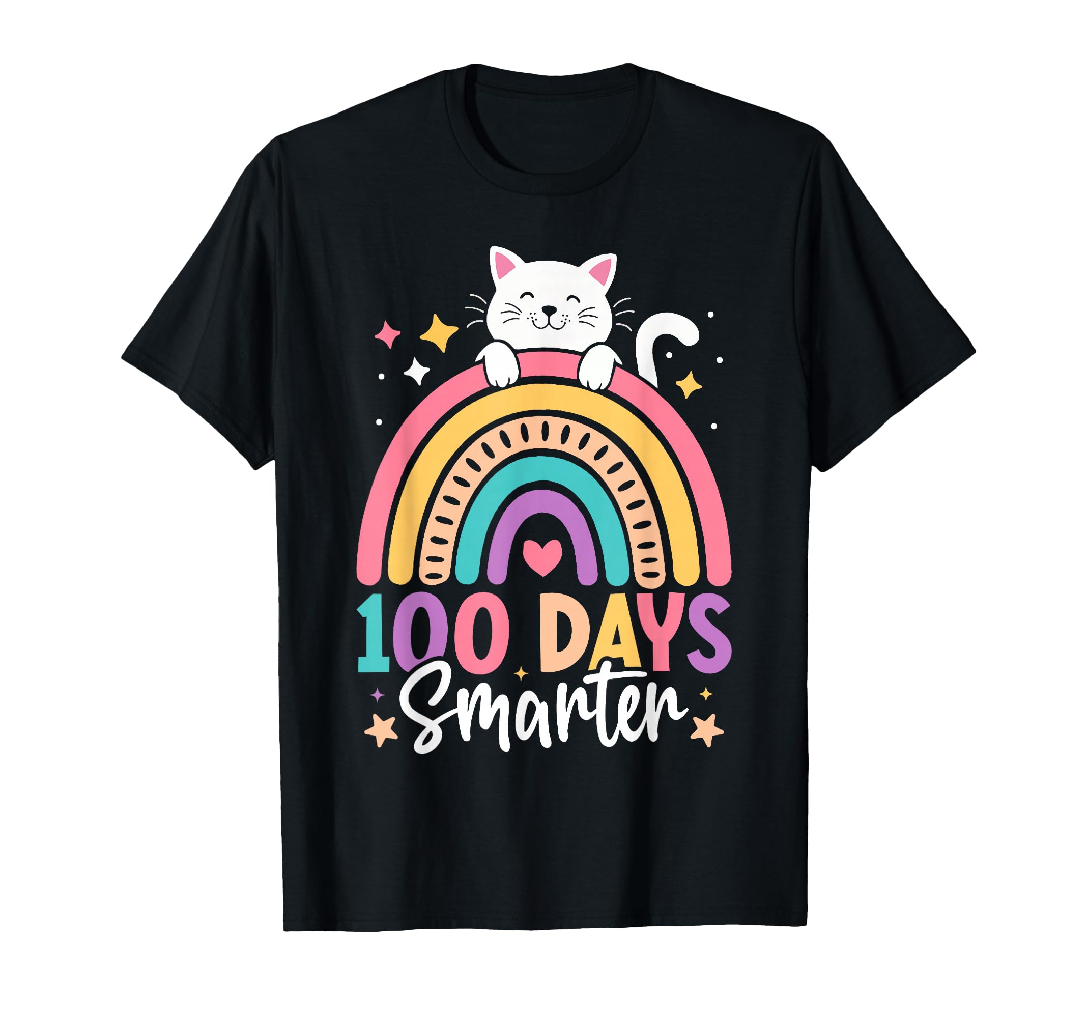 Cat design. looking for a kitten cat 100th day of school outfit for kids? this one saying 100 Days Smarter featuring a cute cat surrounded by colorful stars and hearts would be great for him/her, and a gift for female teacher on 100th day of school A Cute Girls 100 days of school for daughter, granddaughter, girls & a Girls matching 100th day of school outfit for a pre-school, pre-k class, kindergarten, middle school, elementary, primary teacher who survived their first 100 days of school Lightweight, Classic fit, Double-needle sleeve and bottom hem