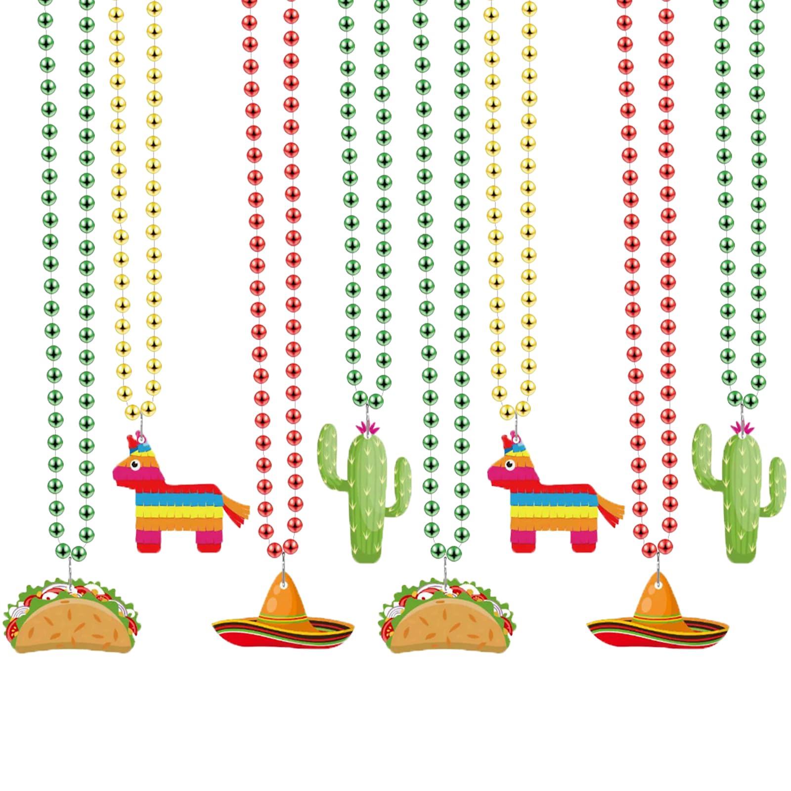 What You Get - 12 PCS vibrant color Mexican themed beaded necklaces in 4 design,each one has 3 pcs,enough quantities to meet your needs for fiesta party decorations. Mexican Party Theme - Long beaded necklace is designed with Mexican sombrero hat,taco,alpaca pinata and cactu pendants,all elements matches with Mexican party themed,creating a joyful festival atmosphere. One Size fit Most - Cinco de Mayo beaded necklace measures approx. 32 inch/ 82 cm long,the pendant approx.3.1 inch/8 cm,universal size fitting for both adults and kids. Premium Material - The Fiesta necklaces are made of gold,red and green metallic plastic that make it looks shiny.The cute pendant are made of felt,lightweight design makes for comfortable wearing. Idea Party Decoration & Gift - These colorful fiesta accessories will create a great atmosphere for your friends and family.Suitable for the Fiesta party,Cinco De Mayo party supplies,Mexican theme party decorations,fiesta birthday party ,bachelorette party decoration and other events. Fiesta Accessories