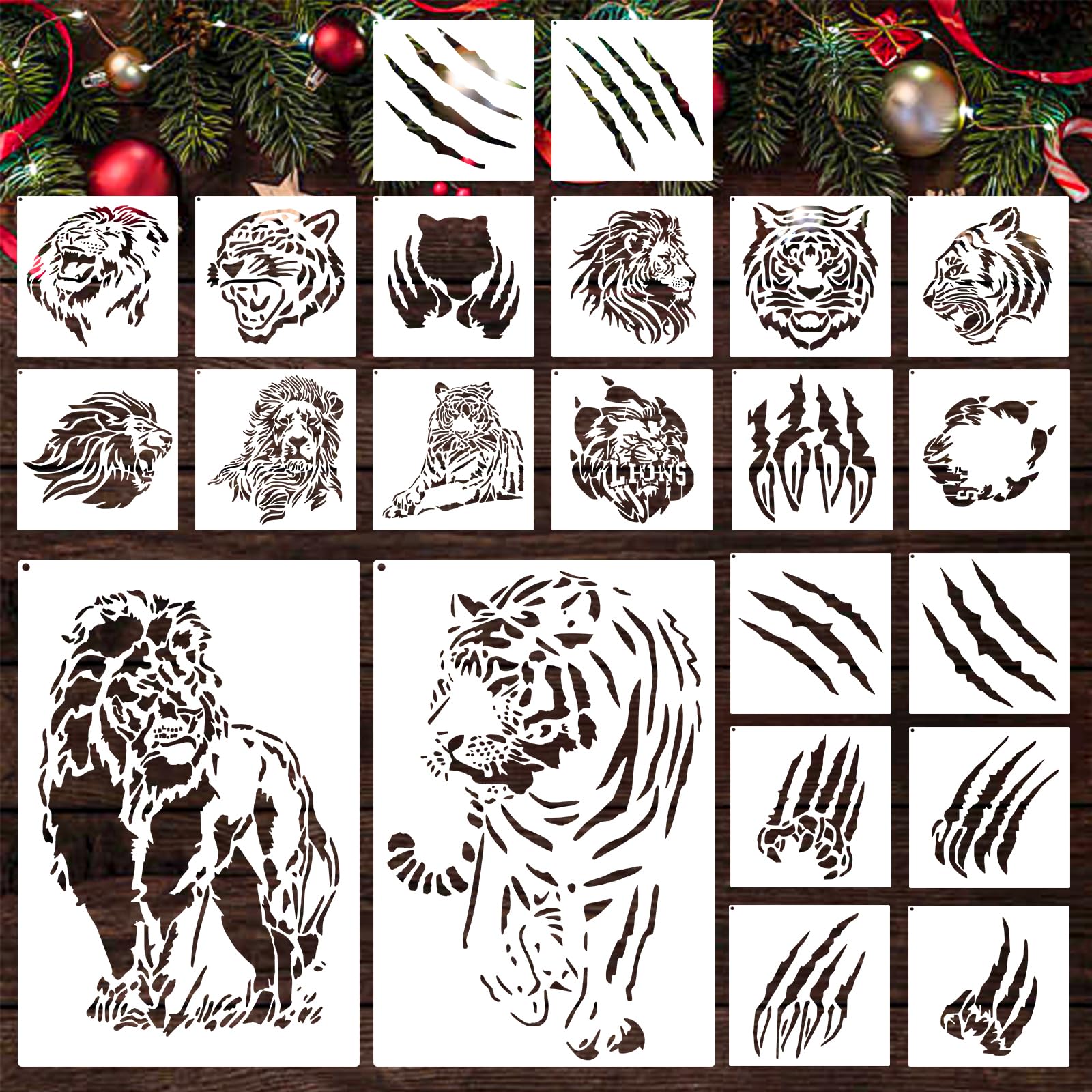 PACKAGE INCLUDES: This package includes 22 pieces lion tiger print stencils of 2 different sizes. The largest size of the tiger print stencil is 11.5×8.2 inches and the smallest lion tiger print stencil is 6×6 inches. Sufficient quantity and different sizes can meet your various decoration needs. ELEGANT DESIGN: The tiger paws and tiger print design templates are sure to be loved by everyone. Lion stencils and tiger stencils include a variety of shapes for you to decorate fabric canvas paintings to bring your art projects to life. HIGH QUALITY: Our lion tiger print templates are made of high- quality PET plastic material with good durability and flexibility. These different sizes of templates meet your different needs and ensure that you will use them for many years. SAVE TIME: Our lion tiger print templates use a translucent process for easy alignment, so you can fix and then paint very easily. Using these templates to complete the painting will save you time and effort. The lion tiger print stencils can be cleaned with soapy water after use and the reusable template is easy to clean. WIDE APPLICATION: Our lion tiger print stencils are suitable for a variety of craft creations, DIY art projects, walls, wood sign, home decorations, canvas, fabrics, metal, floors, tile, furniture, table and more. 22 PCS Lion Tiger Stencils, Tiger Paws Reusable Plastic Paint Templates for Painting on Wood, Lion Tiger Stencils Set for Canvas Drawing Art Fabric Tile Home DIY Craft Decoration (2 Size)