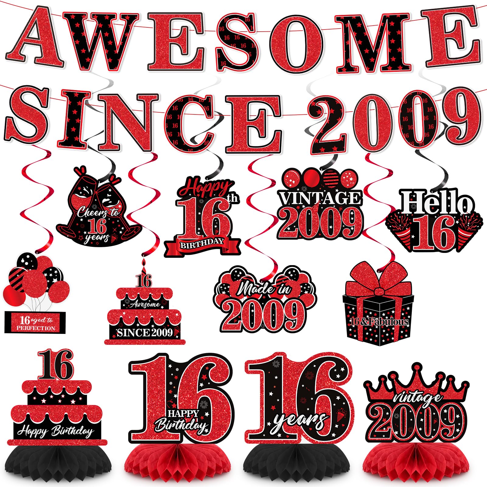 Package List: With the 16th glitter red and black birthday party decorations for girls and boys, you will receive 1pc glitter red and black "Awesome Since 2009" banner, 8pcs glitter red and black 16th birthday hanging swirls, 4pcs 16th birthday honeycomb centerpieces. Glitter Red and Black 16th Birthday Decor: The sparkling 16th birthday banner decoration features vintage birthday eleboysts, including black and red cakes, gift boxes, balloons, "Made in 2009", "Vintage 2009" slogans, "Hello 16", "Cheers to 16 years" slogans, etc., which can make your 16th birthday party more interesting and impressive. Easy to Use: Just assemble the red and black 16th birthday banner, hanging swirls and honeycomb centerpieces. The assembly process is very easy and will save you time. Durable Material: The red and black 16 years old birthday banner and cards are sturdy cardstocks, and the hanging swirls are made of durable plastic that is shiny and won't easily deform. And the 16th birthday honeycomb centerpieces are made of high-quality paper, which are durable. Wide Application: The red glitter sweet 16th birthday decorations for girls and boys can be applied in 16th birthday party for girls and boys, 16th anniversary party, indoor or outdoor birthday parties, shower, and wall DIY decorations, etc. You can use them to decorate walls, windows, tables, doors, yard fences or anywhere.