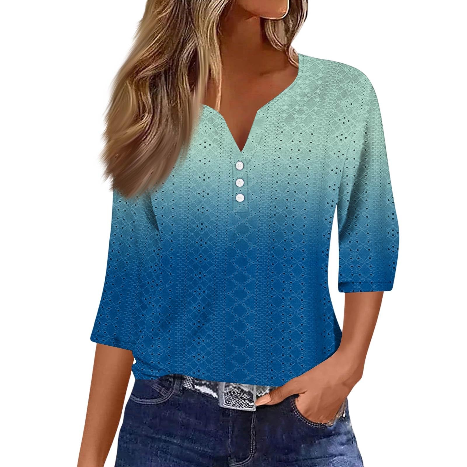 3/4 Sleeve Tops for Women Button Down Henley V Neck Cute Floral Print Shirts Loose Fit Summer Dressy Casual Blouses