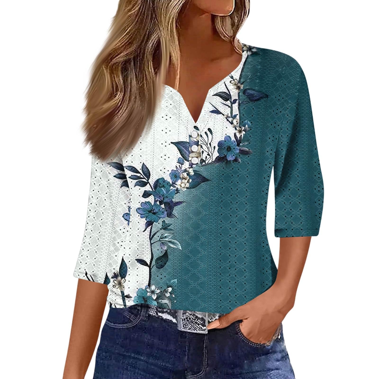 3/4 Sleeve Tops for Women Button Down Henley V Neck Cute Floral Print Shirts Loose Fit Summer Dressy Casual Blouses
