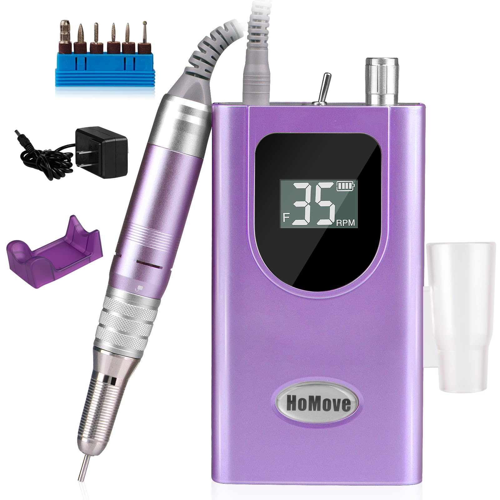 Rechargeable Nail Drill : Full charge takes about 1.5-2 hours, and the electric nail drill machine can be cordless continuous use up to 10 hours. This rechargeble nail drill machine is quipped with LCD Display and battery indicator, which can show clearly the RPM when working and battery remaining capacity. Adjust FWD/REV button to change the spin direction. Maximum Speed 35000 RPM: This professional nail drill is equipped with a high-quality brushless motor that rotates the variable speed control button to make it work smoothly at an adjustable speed (0-35,000 RPM). For salon professional nail technicians or people who want to start their nail beauty at home, this is an ideal nail drill machine. Lightweight and Low Heat Handpiece: HoMove nail master drill is made of high-quality aluminum alloy, it's light weight with low noise, low vibration, low heat for handling. At the same time, there is no need to worry about hurting the nails,suitable for both professional use in salon and home.This rechargeable efile nail drill is convenient and compact for carrying, which is designed for both right & left-handed operators. Versatile & Easy to Use: Although it is professional-level, the portable nail drill is very easy for beginners; HoMove acrylic nail drill comes with 6pcs different drill bits for a widespread use, multi-functional for easily grinding, carving, cutting, polishing,dead skin, removing gel polish and cuticles for both acrylic nails and natural nails. Your satisfaction is all we work for. We provide a 60-day return service for our efile nail drills.If you have any problems about our efile nail drill,please feel free to contact us, we will help you with a satisfying solution. HoMove efile nail drill is a creative perfect acrylic nail drill for nail art. It has forward (FWD) and reverse (REV) two-way rotation, designed for both left-handed person and right-handed person. With an adjustable speed from 0-35,000 RPM. The multi-function acrylic nail drills are widely used for manicuring, pedicuring, shaping, polishing, removing the nail jewelry, removing the acrylic nail and gel nail, solving hangnail and calluses and etc.