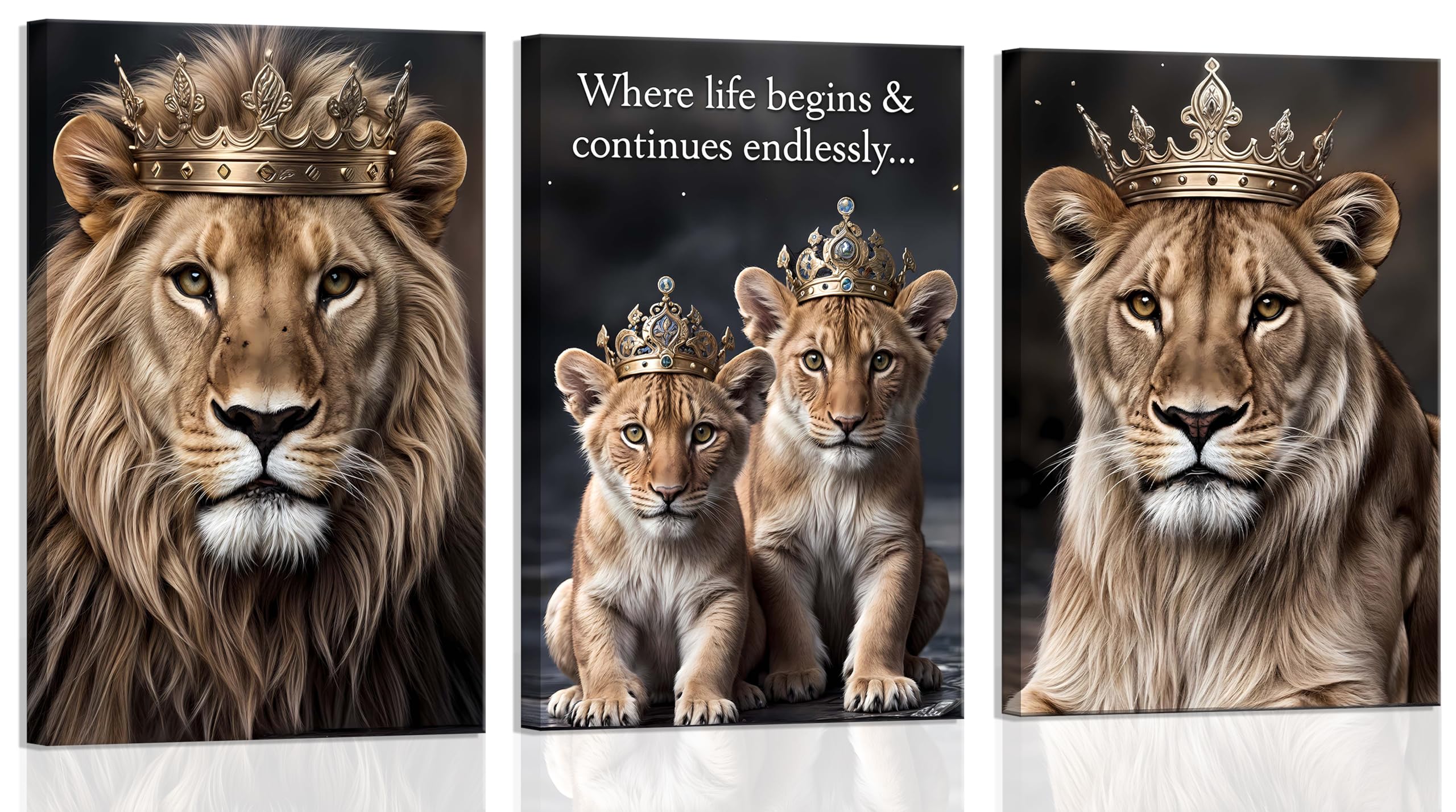 【Lion Wall Art with a Distinctive Theme】:Wall art size 12x16 inches (30x40 cm) 16x24 inches (40x60 cm) , For your reference and selection and comes with solid wood frame gallery packaging and hooks.The three paintings have a unified design style, coordinated colors, exquisite designs, and lifelike. They can be displayed separately or hung in combination to add a sense of layering and artistic atmosphere to the wall. 【Lion Wall Art Inspiration】: Wall art is based on the theme of lions, consisting of two adult lions with crowns and one child lion with two crowns showing the majesty and warmth of lions, ,The poster has "Where life begins & continues endlessly",it represents the continuation and inheritance of life, and conveys the concept of hope and rebirth. 【Applicable Places】: Suitable for living rooms, bedrooms, bathrooms, offices, etc. I hope our modern lion wall paintings can add some chic colors to your life. 【Well-prepared Gift】: The lion print on canvas is a perfect gift for relatives and friends on birthdays, weddings, anniversaries, various festivals, etc. It is a perfect choice for wall decoration and home decoration. 【After-sales Service】: We carefully check our lion wall decorations to ensure quality. If you have any problems with the wall art you received, please feel free to contact us.