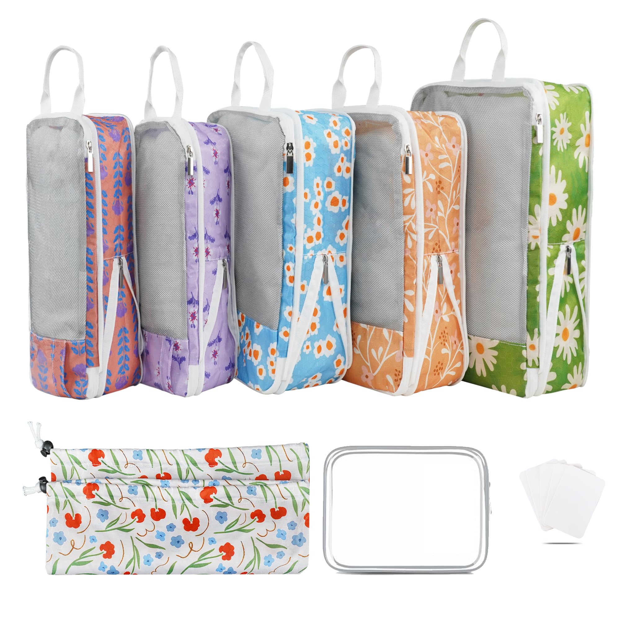 Ideal Design of Travel Packing Organizers: Never dig through messy luggage again or stress over forgotten items! Our compression travel cubes keep everything visible. Each packing cube features unique patterns for quick identification and personal flair, making travel organization effortless and stylish Space-saving and Efficient Compression Design: Unlike regular packing cubes, Engineered for maximum space efficiency, our travel packing cubes feature durable SBS two-way zippers, simply zip on to remove air and watch your clothes flatten- boosting luggage capacity by 100% without vacuum sealing Lightweight and Machine Washable: Travel smarter with our ultra-lightweight packing cubes—they add zero extra weight to your luggage! Made from quick-dry Oxford fabric, they hold their form and color trip after trip. The breathable mesh keeps clothes fresh, while sun and wear resistance ensure they stand the test of time. A must-have for every frequent traveler 7 Set Compression Bags for Travel: Includes 3 different sizes of travel compression bags for packing(5 pieces), 1 toiletry bag, 1 drawstring travel shoe bag/laundry bag. With these compression cubes, you can ensure that the clothes in your suitcase are neatly organized, and packing becomes effortless. Each of the 5 compression cubes has a label pocket on the front, which makes it easy to sort items and quickly find the clothes you want most Versatile Luggage Organizer Bags: Pack Smarter, Travel Lighter! These ultra-lightweight, space-saving cubes fit any luggage - from carry-ons to weekenders. Your essential organizer for business trips, family vacations, camping and all your adventures! A must-have for frequent travelers and neat freaks! Our travel compression packing cubes come in various sizes to choose from, suitable for most handbags, backpacks, and luggage bags. Travel organized, travel uniquely.