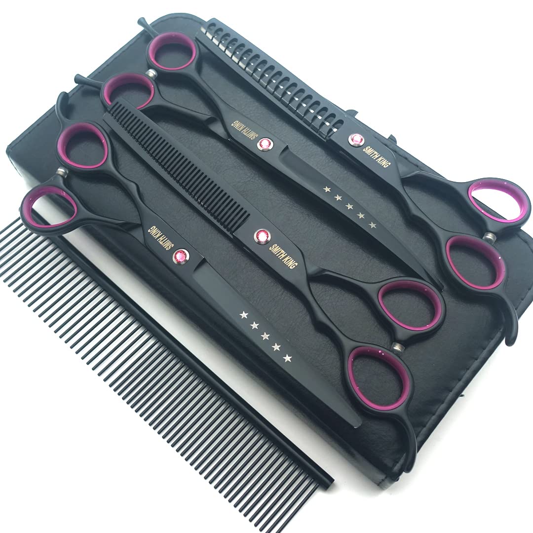 SHARP EDGE. The edge line of the blade is evenly polished,which make the scissors durably sharp.With meticulously crafted clear tip of tooth ,the thinning scissors are sharp and do not clip the hair.The edge of the curved scissors is 25°-30°,majority standard angle to satisfy most part of groomers. GOOD MATERIAL & TECHNOLOGY.The scissors are made by high-quality 6CR stainless steel with high hardness, so that the scissors are durable,sharp.Each scissors suffers forties process carefully polishing and grinding,so that the scissors are better quality and more durable FIT FOR the RIGHT-HANDED & LEFT HANDED. No matter you need right-handed dog grooming shears or the left-handed grooming shears,this shears are your perfect choice.The ‘A’ style of the Handle design makes them fit for almost all the people. COMFORTABLE TO HOLD, WITH SOFT SILICON RINGS INSTALLED.With soft silicon rings stalled to the handle, you can feel very comfortable to hold the scissors in hand.You can also remove the rings if you don’t like.With this kit, you can do a whole grooming for dogs and cats ,It is a good kit for flea protecttion for cats and dogs AFATER-SALE SERVICE.We are a professional manufacturer, very confident in the quality of the products, so we provide 3 months unconditional return.If you are not satisfied with our products, you can contact us seller to get a replacement or refund. AFATER-SALE SERVICE.We are a professional manufacturer, very confident in the quality of the products, so we provide 3 months unconditional return.If you are not satisfied with our products, you can contact us seller to get a replacement or refund. Features: Size : 7.0 in. Material :high-carbon stainless steel Hardness:56HRC Teeth of the thinning scissors: 39 teeth Teeth of the chunkers : 19 teeth Parts list: 1 straight scissors 1 thinning scissors 1 chunkers 1 curved scissors 1 comb 1 case 1 cleaning clothe. Scissors maintenance instructions1.Please don't cut the air. 2.High quality steel, high sharpness, when you use the scissors,you must pay attention to safety. 3.Please keep it clean after using,can lubricated if necessary. 4.Please be careful with the scissors,don't drop from high level,this will destroy marginal adaptation of the scissors. 5.Don't use them to cut metal objects.The scissors can only be used for hair trimming, otherwise it will shorten the life of using.
