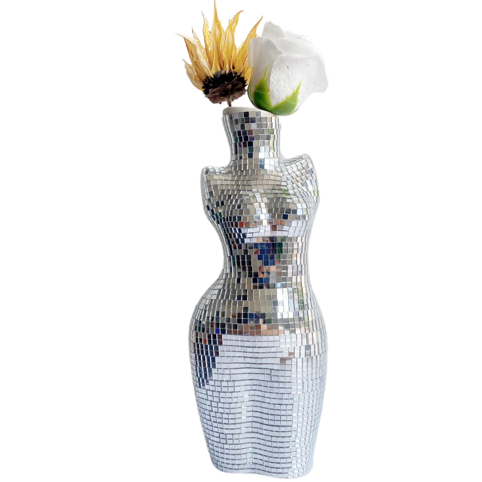 Modern Design: Features a contemporary and playful shape, adding a touch of whimsy and elegance for this vase to any space, lso comes with a fun disco theme with mirror reflective surfaces, perfect for adding a pop of color and vibrancy Eye-Catching Decoration:The disco reflective surface adds vibrancy and movement to any space, capturing light and drawing attention in both daylight and evening settings.This vase is ideal as a centerpiece for living rooms, dining areas, or entryways, offering a blend of elegance and fun Versatile Usage: Designed to hold flowers while remaining compact, making it suitable for various home or office spaces.Can be used as a decorative vase for fresh or artificial flowers, or as a standalone sculptural piece for shelf or table displays Charming Gift:This handmade ceramic disco vase offers a blend of artistic expression and playful disco aesthetics, making it a stylish and functional decorative piece for any modern or retro-inspired space,it is a perfect for your friends and family Various Sizes: Available in 3 different sizes to suit various spaces and preferences,the small size is 4x2.7x5.7inches ,the middle size is 3x2.4x7inches and the large size is 3.2x2.2x 8.8inches,can place a short single flower, or matched with dried flowers or pampas hay according to your decor need Features a shimmering, mirror-tiled surface inspired by disco balls, creating a dazzling effect that reflects light beautifully, adding a touch of glamour to any room.