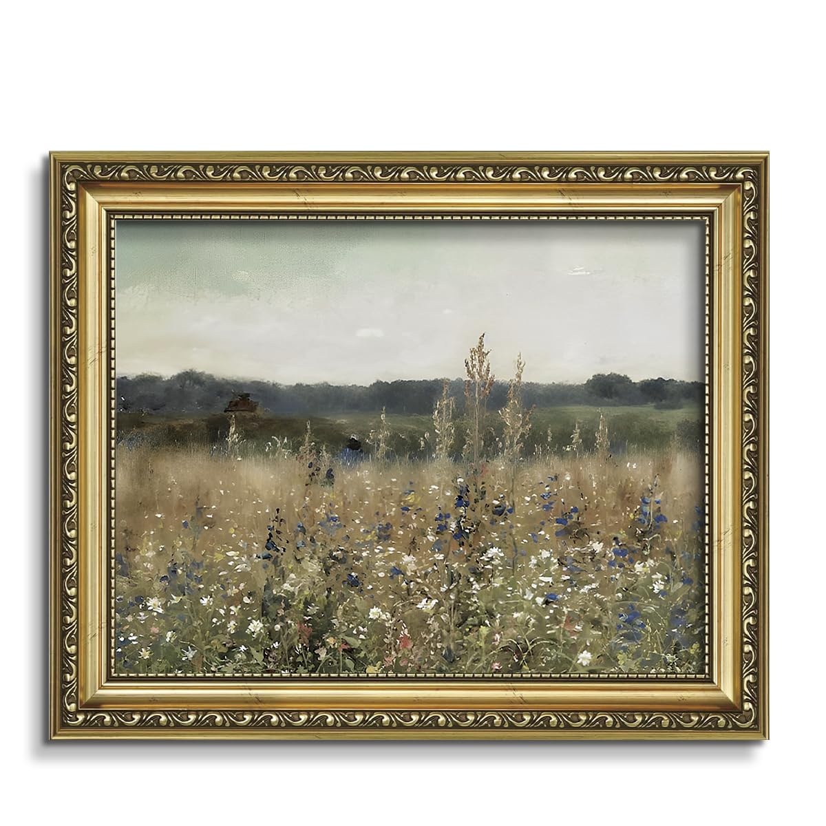 Color Application: Natural colors are mainly used in images. The golden wheat waves and green vegetation showcase the scene of a bountiful harvest, while the blue flowers add a touch of freshness and tranquility to the picture. The sky presents a faint blue-green color, giving people a feeling of early morning or evening, creating a peaceful atmosphere. Composition Technique: The foreground of the picture features blooming wildflowers and tall wheat stalks, while the middle scene shows faintly visible farmhouses and fields. This sense of hierarchy makes the image appear profound. The location and size of the farmhouse are moderate, providing excellent visual guidance and allowing the audience to deeply appreciate the charm of the scenery. Theme Expression: This painting conveys a peaceful rural living atmosphere through delicate brushstrokes and soft colors. The farmhouses and fields in the painting evoke the leisurely life of the countryside, providing a sense of spiritual comfort. Meanwhile, the wildflowers, wheat waves, and distant forests in the fields depicted in the painting showcase the vitality and infinite charm of nature. Widely Applicable: This classic oil painting showcases the vibrant colors and intricate details of plants, creating a captivating visual masterpiece for your space. Meanwhile, the frame of this painting enhances its vintage feel. It is suitable for bedrooms, study rooms, living rooms, offices, dormitories, galleries, cafes, and more. Our wall art pieces offer a variety of styles to enhance your decorative level. Customer Service: Our vintage canvas framed art paintings have a wide range of applications and can add more classic and elegant elements to your space. However, before purchasing art, please carefully measure and calibrate the dimensions. For example, you can test walls with cardboard of the same size to choose the most suitable size and reduce unnecessary trouble. Meanwhile, if you have any questions, please let us know and we will handle them as soon as possible. We take the concept of integrating art into life and analyze art decorative paintings from a professional perspective to help those who love painting understand it and enjoy a "noble and not expensive" boutique life. Our wall art pieces offer diverse styles to elevate your decor.Decorate your living space with vintage canvas art paintings, showcasing charming vintage floweral landscapes and plant themes, adding a touch of romantic and nostalgic charm to your room. This oil painting is made of PS material, which is lightweight and easy to hang. At the same time, this art painting is framed, with a vintage texture that enhances the artistic atmosphere of the painting. Our paintings come in various sizes to choose from, and you can choose the appropriate size based on the scene you are decorating.