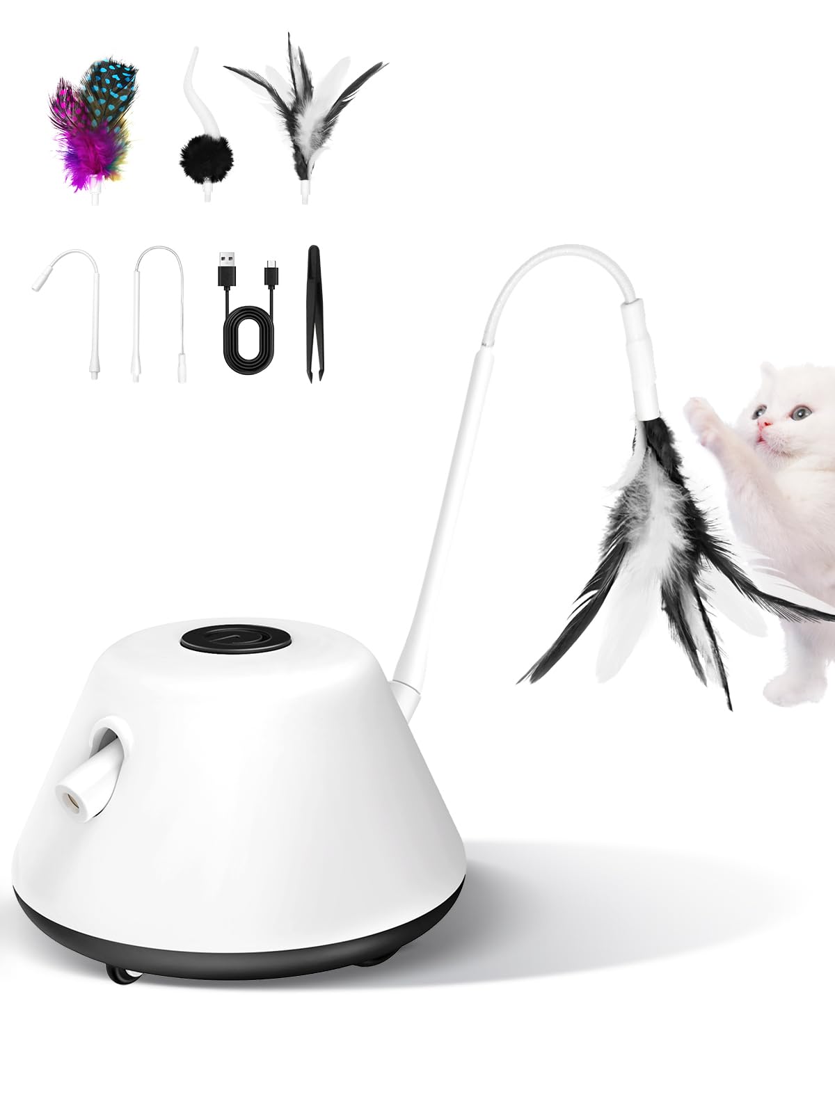 Automatic Interactive Cat Toy :This cat toys for indoor with 3 different removable feathers and can adjustable angles,can spark cats' interest to self-play, offer hours of fun,the automatic cat toy also supports DIY like hanging a catnip toy to explore more fresh experiences between you and your feline friends. 3 Speed Modes: The automatic cat toy has 3 speed modes (fast, slow, random)and combines moving S shaped-route,forward/backward 360°spin to engage your cats in a chase, stalk, swat, or pounce, mimicking prey,encourages natural hunting instincts while mitigating behavioral issues like excessive meowing or furniture scratching, keeping your kitty agile, healthy, less stress and anxious.which not only catering to your cat’s mood and activity level, but also ensuring freshness and unpredictability in play. Smart Designed Electronic Cat Toy:Our electric cat toy comes with a USB charging cable for up to 2 hours of playtime on a single charge,the toy automatically turns on when your cat touches it and shuts off after 5 minutes of inactivity.When you are resting or working, cat can play alone without disturbing you. Non-Disturbance: The indoor cat toy equipped with powerful motor runs quietly with minimal mechanical noise, perfect for your peace of mind. Its sturdy construction and rubber wheels ensure long-lasting use on various floor surfaces such as: floor, hardwood floor, carpet, tile, linoleum. There are enough ways to stimulate a cats nature when living indoors.(Note: not recommended for shag like pile carpet.)If there is cat hair stuck on the wheels, you can use pincette to clean it up and keeps moving smoothly. Perfect Gift for Cat:This Moving cat toys suitable for cats of all ages, whether they are kittens, adults, or seniors, is a unique gift,when your cats are bored, frustrated or in need of exercise and when you want to enjoy some alone time, This Kitten toys keeps them busy and lets them have fun and get some exercise. Specification: