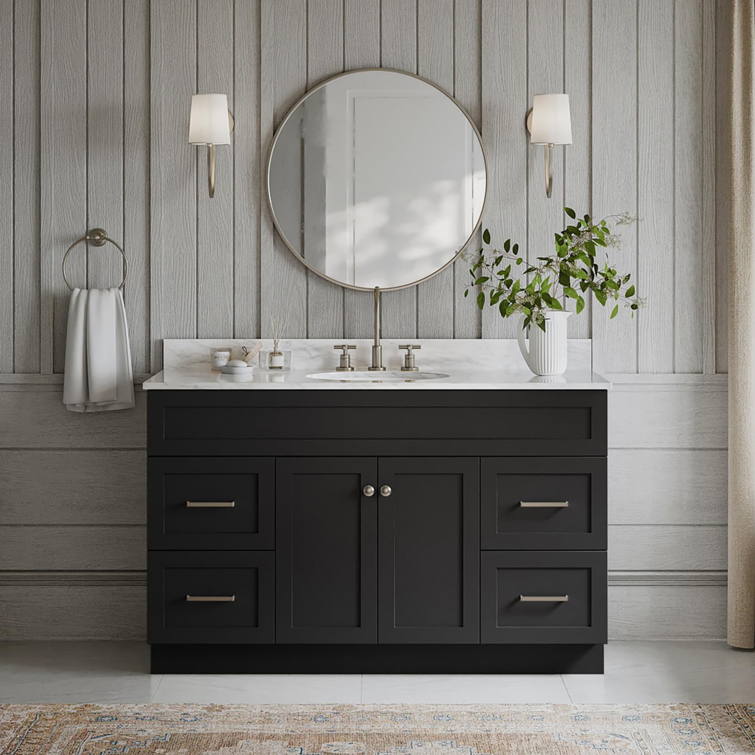 Solid hardwood- This 55" inch single sink bathroom vanity is made of Solid hardwood & Plywood Contruction. It is the most durable and sturdy wood Material for bathroom vanities. Another advantage of plywood is that it will resist expansion and contraction with moisture accumulation and temperature changes. No cracking, warping or paint peeling. There is No MDF or cheap particle board on the entire vanity. ARIEL bathroom vanities are made to last. Black painted finish. Carrara White Marble- Is one of the iconic luxury Italian marbles. A premium and rich fine-grained white marble with gray lines or waves like branches of rivers, featuring shades of white and gray. This marble due to it's beautiful colors matches with many products. Polished finish with a 0.75 thickness for a modern sophisticated look. Countertop is pre-drilled for a 3-hole faucet 8" widespread. 1 ceramic oval UPC certified under-mount sink included. No Faucets Included. Features- 2 Soft-closing doors, 4 full extension self-closing Dovetail drawers. You will never have to worry about hearing any doors or drawers slamming ever again. Simply push and allow for automatic gentle self closing. Dovetail Contruction enhances the sturdiness, durability, and craftsmanship of these cabinets rarely matched by ordinary drawers. Drawer length is 16 1/2". Drawer height is 4 3/4". Satin Brass hardware pulls are standard 5" inches. Installation- The vanity base cabinet will arrive fully assembled. It has an Open back for easier Installation. Countertop is not attached to the vanity. You will need to attach the sink to the Countertop and Countertop to the 54 inch bathroom vanity cabinet. With the top installed, the overall Dimensions are 55" x 22" x 36". Backsplash height is 4" inches. Installation instructions available. DIY or professional Installation is an option. Center offset sink configuration. Included-vanity base cabinet,countertop,sinks,hardware, and backsplash. Not included. No faucets,drain,bathroom vanity lights or mirror. Give your bathroom decor a makeover with a modern bathroom vanity from ARIEL. The Hamlet series offers a new thin carrara white countertops mounted above solid wood cabinets. With satin nickel finish hardware on the drawers and cabinet doors, these vanity sets will add an elegant aesthetic to a bathroom remodel.