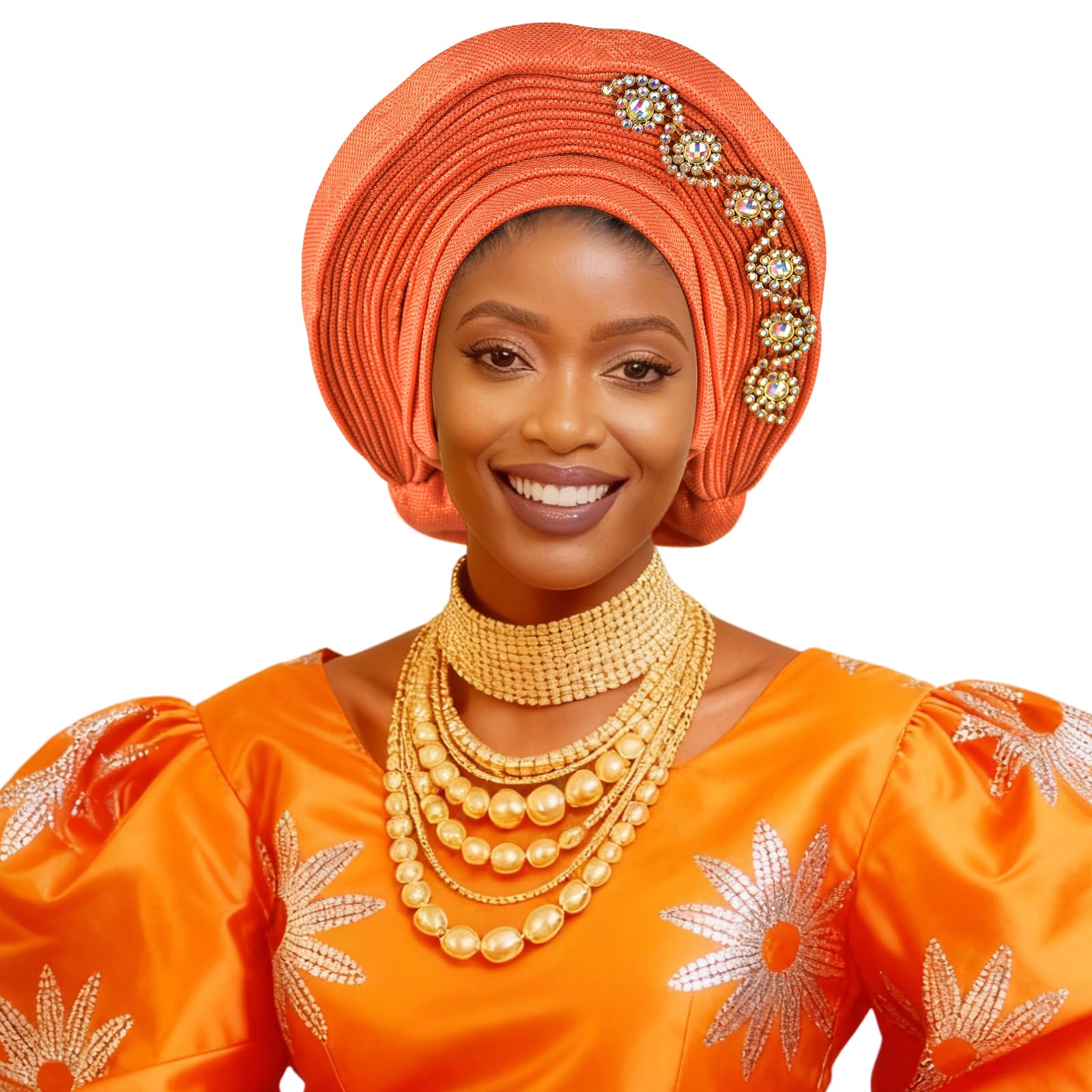 Diverse Collection: Our range includes African turbans, hats for women, and traditional Nigerian gele headties, offering a variety of styles to suit any occasion. Handcrafted Excellence: Each piece is meticulously hand-sewn by skilled artisans, ensuring top-notch quality and attention to detail in every head wrap and head tie. Auto Gele Convenience: Our auto gele head ties provide the perfect blend of tradition and modern convenience, allowing you to achieve a flawless look with ease. Stunning Embellishments: Adorned with rhinestones, our head wraps and head ties add an elegant sparkle, making them perfect for special events and everyday wear. Cultural Celebration: Embrace your heritage with our beautifully designed African head wraps, reflecting the rich cultural traditions and contemporary style of Nigeria and beyond. Exquisite African Turbans, Hats, and Nigerian Gele Headties Stylish African Head Wraps and Auto Gele Head Ties