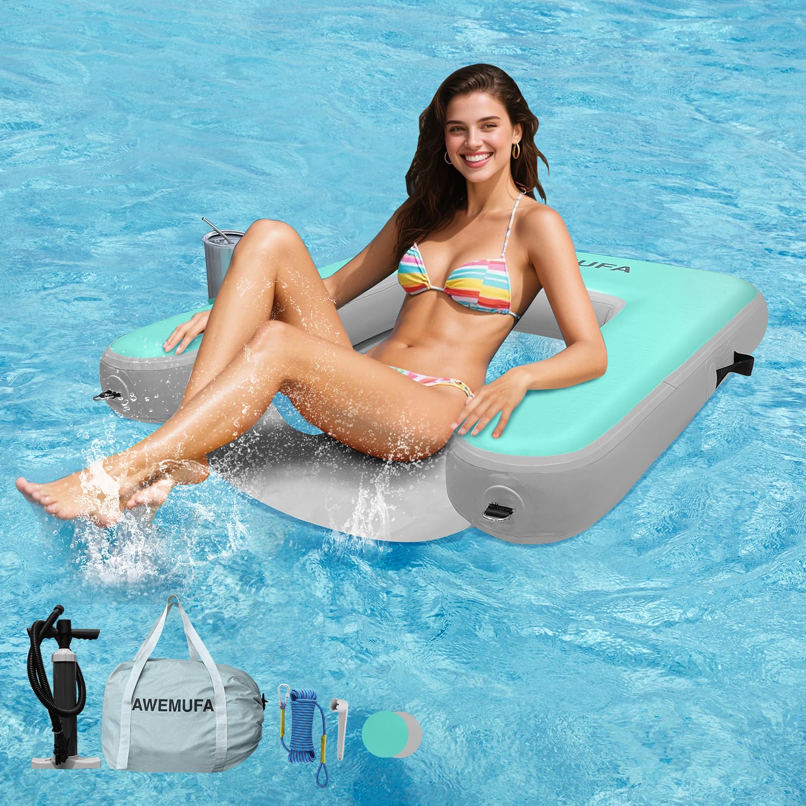 TRIPLE-COAT PROTECTION FOR LONGEVITY: Our Inflatable Floating Chair is constructed with a high-density composite drop-stitch core and wrapped in a tough PVC material. It features an airtight layer for enhanced buoyancy, a fusion layer for durability, and a protective layer to shield against sun damage, ensuring it remains stable and looking great for all your sunbathing adventures in the Swimming Pool, Lake, or River STURDY AND WEIGHT-SUPPORTIVE DESIGN: Capable of supporting up to 300 pounds, our Lounge Float is the perfect companion for a day of relaxation. When inflated to the recommended 5-7 PSI, it offers a secure and comfortable platform for sunbathing or leisurely floating, whether you are by the pool or on a lazy river ERGONOMIC COMFORT FOR FULL-BODY SUPPORT: Designed with your comfort in mind, our pool float chair features a soft cushion and two armrests that provide full-body support. The anti-tip backrest ensures safety and stability, allowing you to relax with confidence in the water EFFORTLESS INFLATION AND DEFLATION: Simplify your floating experience with dual quick valves for the backrest and seat, making inflation and deflation a breeze. The included hand pump and carrying bag make it easy to transport and store, while the waterproof dry bag adds convenience for your personal items PRACTICAL FEATURES FOR ENHANCED CONTROL: The side grab rope and front hook offer easy maneuverability and the ability to connect with other floating devices, making our Lounge Chair perfect for socializing or family fun in the water. These features, combined with the chair's stability, make it an excellent choice for any water-based leisure activity Our Inflatable Floating Chair is the perfect addition to your pool or lake experience, offering a comfortable and stable platform for relaxation. Constructed with a high-density composite drop-stitch core and wrapped in durable PVC material, this chair features triple-coat protection, including an airtight layer for enhanced buoyancy, a fusion layer for durability, and a UV-resistant layer to protect against sun damage. Capable of supporting up to 300 pounds, it provides a secure and comfortable surface for sunbathing or leisurely floating. Designed with ergonomic comfort in mind, it includes a soft cushion and two armrests for full-body support, along with an anti-tip backrest for safety. Simplify your floating experience with dual quick valves for easy inflation and deflation, and enjoy the convenience of a hand pump and carrying bag for easy transport and storage. The side grab rope and front hook offer easy maneuverability and the ability to connect with other floating devices, making it perfect for socializing or family fun in the water. Whether you're looking for an inflatable chair, pool float, pool lounge chair, or floating pool chair, our Inflatable Floating Chair is the ideal choice for a day of relaxation by the pool or on the lake.