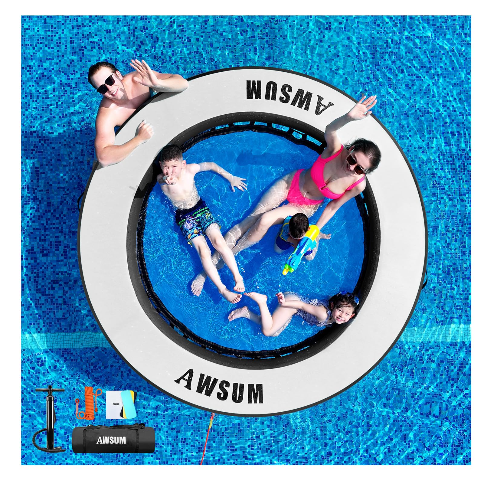 14in Panel Advantages: 14-inch wider panel offers stronger buoyancy for enhanced floatation, greater stability with an anti-tip design, and better weight distribution for higher capacity and more comfortable lounging Safe & Sturdy Materia: Our inflatable water hammock is made of high-quality layered drop-stitch PVC for superior strength and longevity. Versatile Floating Paradise: Perfect for lakes, pools, or oceans! Use as a floating dock, water hammock, tanning raft, swim platform, or inflatable island. Supports multiple activities—relaxing, sunbathing, or group fun—all in one sturdy mat. Spacious & Heavy-Duty Capacity: 8ft diameter x 6in thick design holds 2-6 people (up to 700 lbs). Ideal for adults and families, offering ample space to lounge safely without sinking. Quick 3-Minute Setup: Includes a dual-action hand pump (high/low pressure modes) for fast inflation/deflation. Follow the hose connection guide for effortless setup—ready for water in minutes! AWSUM Inflatable Water Hammock Ring River Raft Round Floating