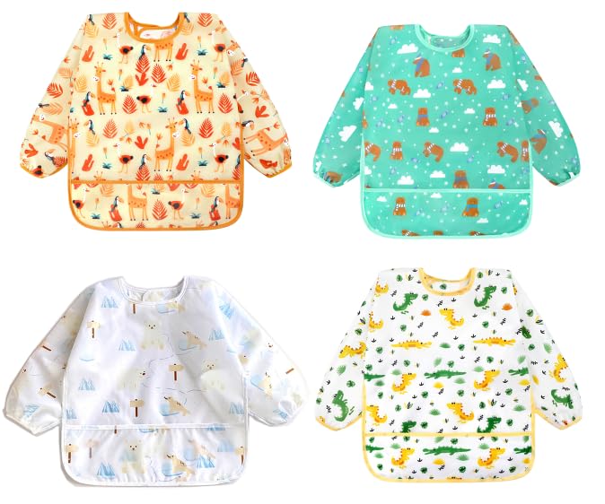 Fully Waterproof-Made of premium waterproof polyester fiber + EVA waterproof layer, the entire bib is waterproof. This Long sleeve bib is Lead-free, PVC-free, BPA-free, Phthalates-free, and Vinyl-free. Great Long Sleeve Baby Bib-Smooth design on the neckline, comfortable and not tight. There is a hook and loop on the back, which is firm and easy to wear. Elastic cuffs, no need to worry about food seeping into clothes. Catch-all Pocket-The large pocket can catch a lot of dropped food, the crumbs, spills and reducing loads of laundry. When playing, the pocket can storage some snacks and other small objects. Lightweight & Easy to Clean-This baby bibs can be repeated use and easy wipe. The material is lightweight and comfortable, baby likes to wear it. Fits 6-36 Months Baby Boys & Baby Girls-Our bibs have cute and attractive patterns. The size fits babies and toddlers from 6 to 36 months. baby bibs, long sleeve bibs for girls boys, toddler bibs for feeding eating, bibs for 24-36 months