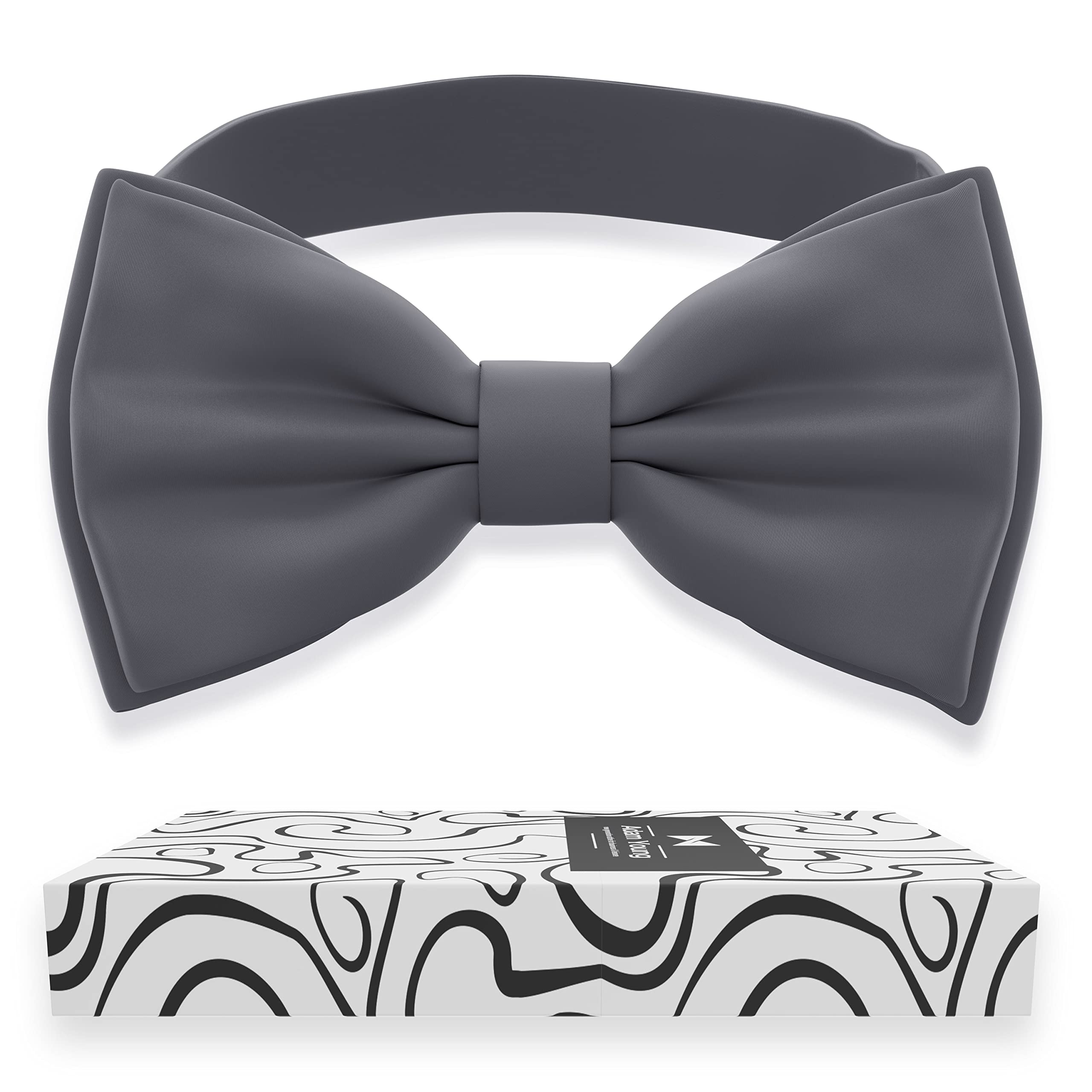 Sizing: The bow of the Large size bow tie is 4 ¾" x 2 ⅓". The strap length is adjustable from 11" to 22". The Large size fits teens, youths, and adults. The bow of the Medium size bow tie is 3 ⅞" x 1 ⅞". The strap length is adjustable from 9" to 19". The Medium size fits infants, toddlers, and school-age children. Color & Materials: The bow tie is made of high-quality materials; it's 100% polyester composition and has a tiny glossy glint on it. The Grey Fog color has various names. If you are looking for dark gray, ash, smoke gray, slate grey, charcoal, graphite, carbon, steel grey, or pewter grey, this shade will be a perfect match. Colors are designed to go with any tuxedo, jacket, outfit, or uniform and with shirts. Uniqueness: Premium 4-layer bow ties are formed to last and feel comfortable. Bow ties are designed with great center knot details and easy-to-use hooks. Easily adjustable sturdy pre-tied bow tie with rust-resistant hardware. Fine quality from the People's Republic of China and made to last all weathers, designed in the USA. Versatility: A stylish unisex bowtie fits perfectly on anyone. You're guaranteed to stand out wearing a high-quality bow tie that will never lose its shape. Huge range from the subtle to the vivacious, for all occasions. For any occasion: Bow ties made to be worn and worn again. This is a perfect bowtie that can match any of your styles. Dress up for a holiday party, cosplay, graduation, wedding celebration, or a special gala.
