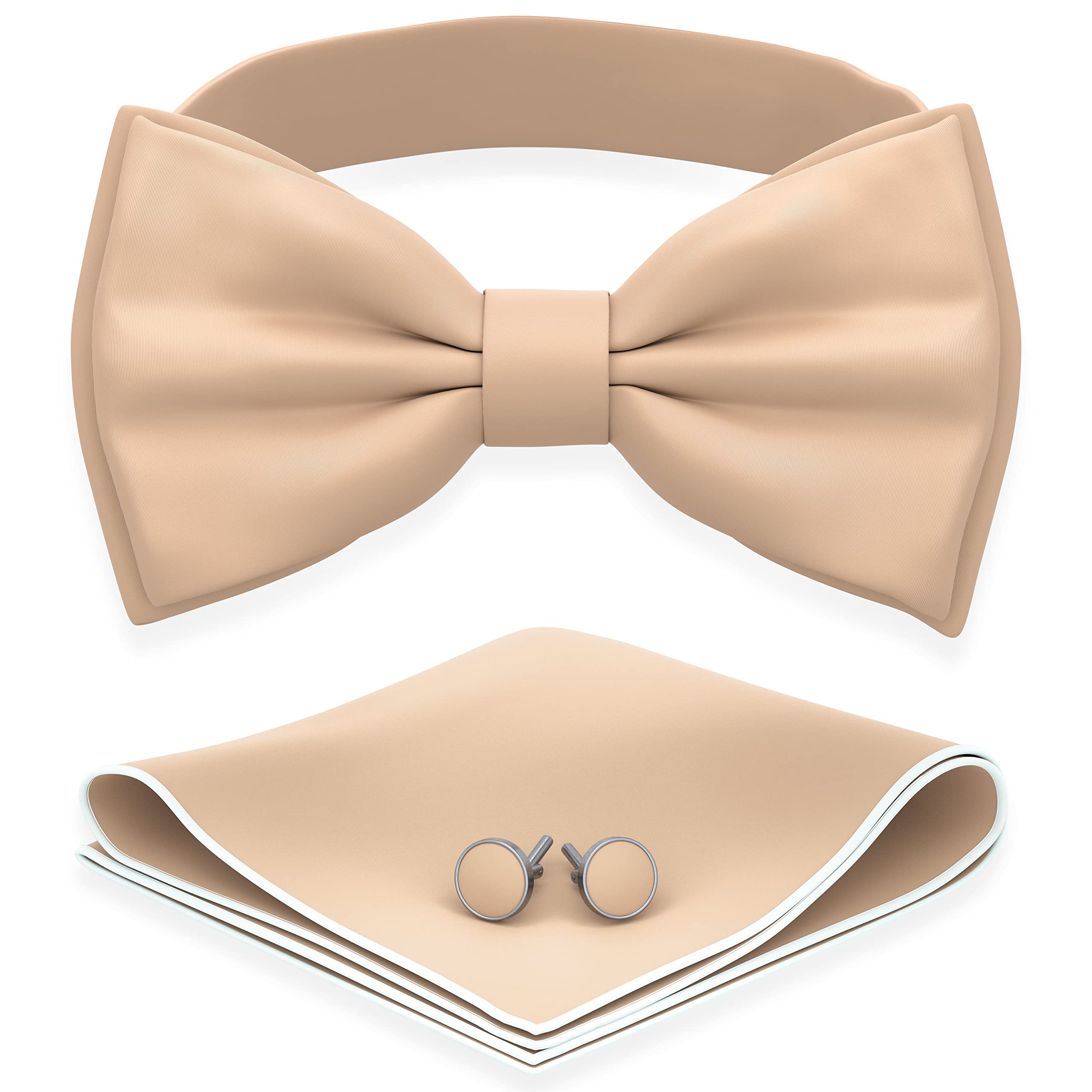 Sizing: The bow of the Large size bow tie is 4 ¾" x 2 ⅓". The strap length is adjustable from 11" to 22". The Large size fits teens, youths, and adults. The bow of the Medium size bow tie is 3 ⅞" x 1 ⅞". The strap length is adjustable from 9" to 19". The Medium size fits infants, toddlers, and school-age children. Color & Materials: The bow tie is made of high-quality materials; it's 100% polyester composition and has a tiny glossy glint on it. The Dune Beige color has various names. If you are looking for tan, camel, taupe, champagne, or copper, this shade will be a perfect match. Colors are designed to go with any tuxedo, jacket, outfit, or uniform and with shirts. Uniqueness: Premium 4-layer bow ties are formed to last and feel comfortable. Bow ties are designed with great center knot details and easy-to-use hooks. Easily adjustable sturdy pre-tied bow tie with rust-resistant hardware. Fine quality from the People's Republic of China and made to last all weathers, designed in the USA. Versatility: A stylish unisex bowtie fits perfectly on anyone. You're guaranteed to stand out wearing a high-quality bow tie that will never lose its shape. Huge range from the subtle to the vivacious, for all occasions. For any occasion: Bow ties made to be worn and worn again. This is a perfect bowtie that can match any of your styles. Dress up for a holiday party, cosplay, graduation, wedding celebration, or a special gala. The bow tie goes with a matched handkerchief and cufflinks.