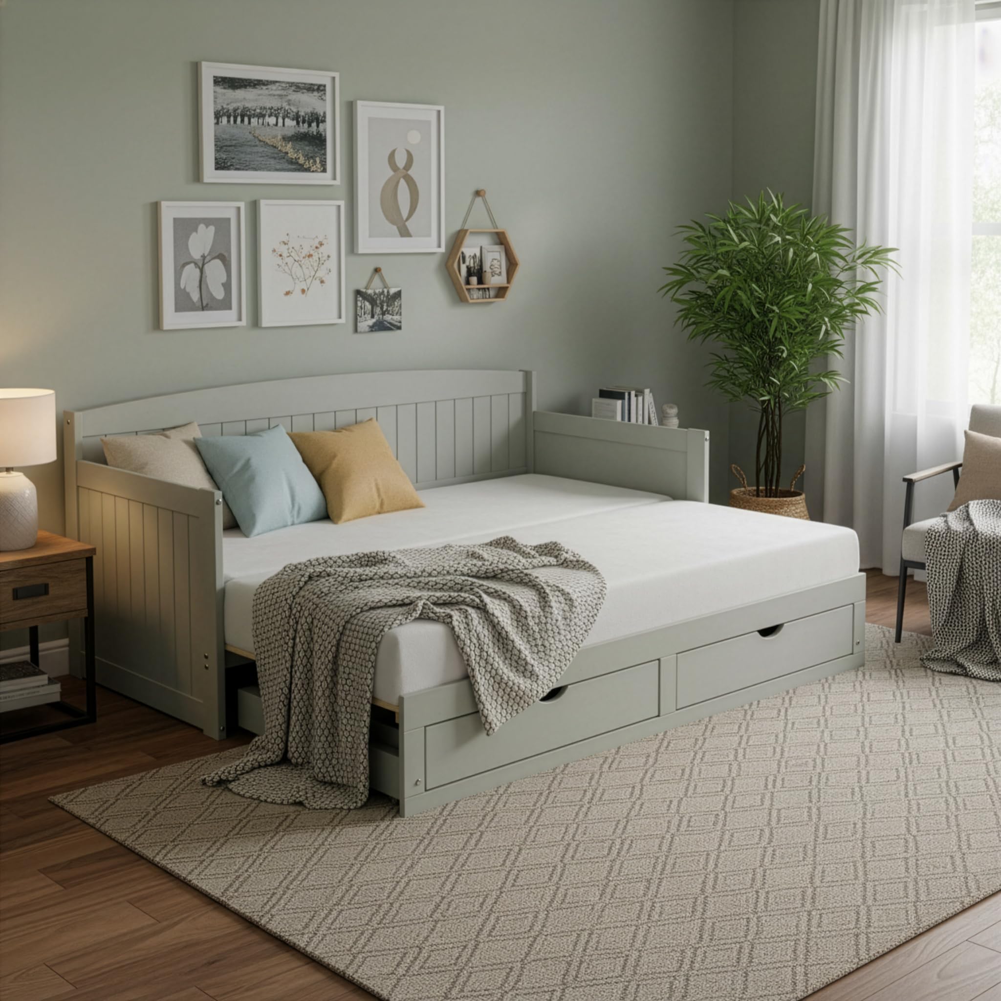 TWIN TO KING DAYBED - Convert this twin size bed frame into a king-size bed with our Alaterre daybed with trundle. Simply add two twin size mattresses (not included) that are 4-6” thick, creating a complete sleep setup, with no box spring required. SPACE-SAVING DESIGN - The daybed twin frame doubles as a modern sofa during the day and a cozy bed at night, perfect for shared spaces, studio apartments, and for sleepovers. It also features 2 pull-out drawers for storing blankets, bedding, and more. PREMIUM QUALITY - This heavy-duty bed frame is made of durable Brazilian pine wood with solid structural pieces that boast a durability to support a total weight of 400lbs. The twin bedframe provides a reliable sleeping space for guests and little ones. SLEEK MODERN STYLE - The trundle bed twin frame features a sleek dove gray finish that is at home with a variety of furnishing styles, pairing beautifully with coastal, modern, rustic, and farmhouse decor. This twin trundle bed can be placed in any room. PRODUCT DETAILS - Materials: Brazilian Pine Wood and Veneer. Dimensions: Overall - (L) 77” x (W) 43.1” x (H) 36.75”; With Trundle Out: (W) 80”; With Drawers and Trundle Out: (W) 97”. Note: Ships in 2 Parcels and May Not Arrive Together. Color: Dove Gray.