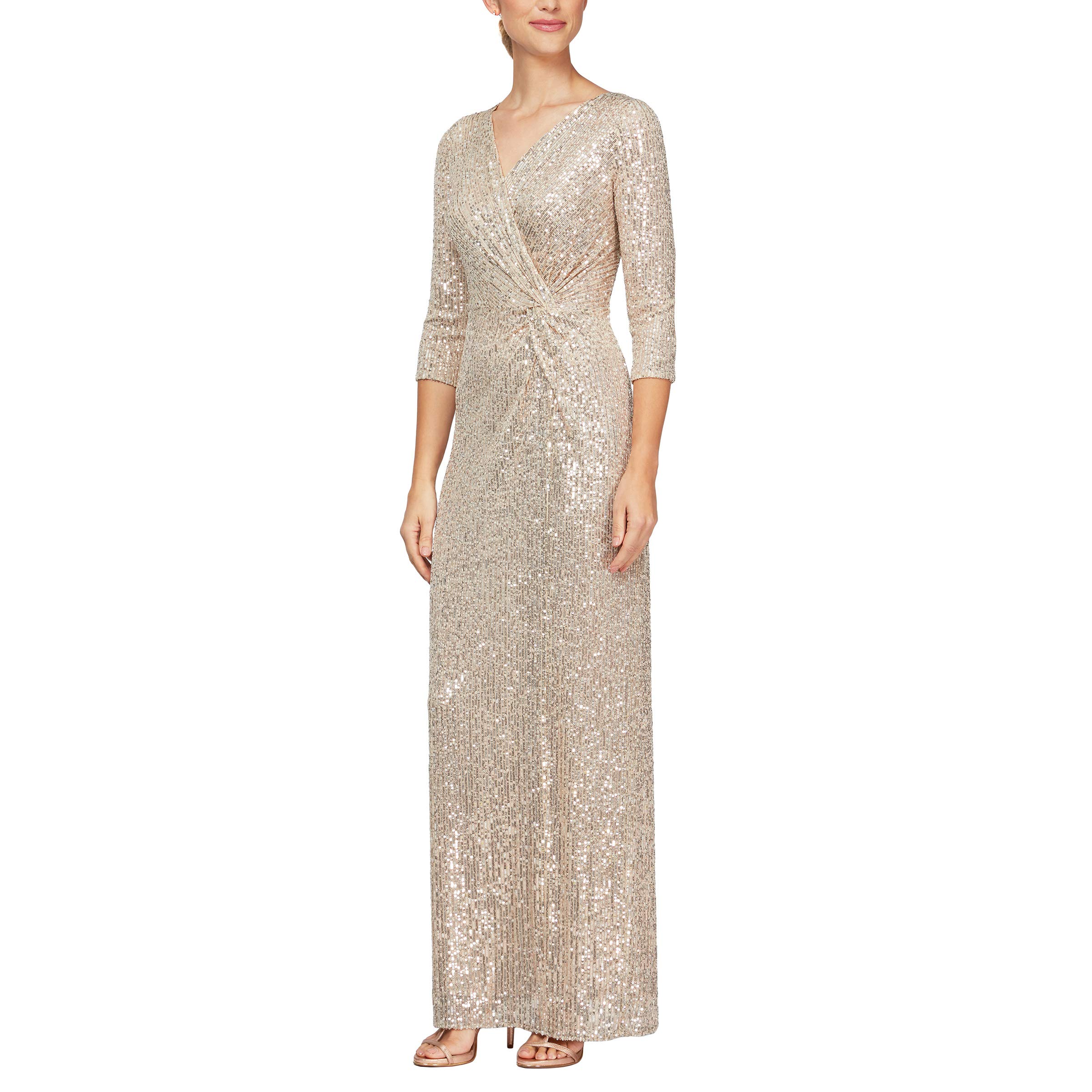 Elegant Formal Wear: Long column dress with a flattering surplice neckline and 3/4 sleeves, perfect for weddings, galas, black-tie events, and other formal occasions. This timeless design offers sophisticated style for any special night out. Luxurious Sequin Fabric: Soft and stretchy all-over sequin fabrication provides all-day comfort and a stunning sparkle. The shimmering material catches the light beautifully, ensuring you'll stand out at any event while feeling comfortable throughout the night. Slimming Waist Detail: Sophisticated knot front design with a cinched tie waist creates a flattering, feminine silhouette. This carefully crafted detail accentuates your curves and provides a slimming effect, enhancing your natural shape for a confident and elegant look. Bra-Friendly Comfort: Designed with your comfort in mind, this dress is bra-friendly, allowing you to feel confident and at ease throughout the celebration in this stunning dress. Sizes for Every Woman: At Alex Evenings, we embrace the beauty of every woman. Our inclusive sizing, from Petite to Regular, and Plus sizes, ensures that our dresses are designed to complement various body types. Find your perfect fit for any special occasion.