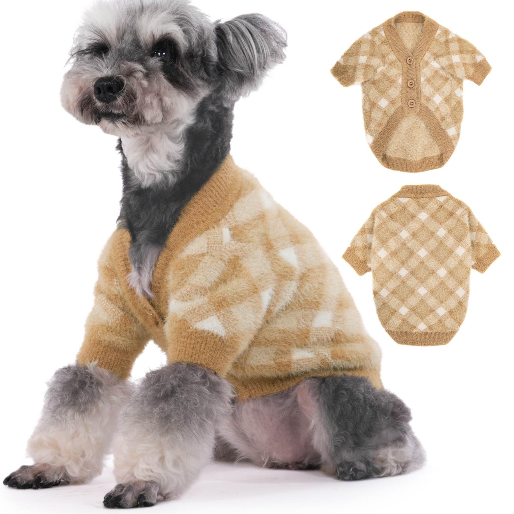 CHECK OUR SIZE CHART BEFORE ORDERING. This is a Stylish Dog Sweater for Small Dogs Boy, Girl and Cats: This dog clothes are typical for SMALL dog breeds and kittens like Bichon Frise, Chihuahua, Yorkie, Shih-Tzu, Maltipoo etc; NOT FOR LARGE DOGS. A Real Deluxe Dog Sweater for Your Furry Babies: This knitwear for small dogs is made from premium minkwool-like blend yarn used in human clothing, velvet-like soft, stretchy, warm and stylish. With vibrant colors, V-neckline, classic royal plaid patterns and front button closure design, those small dog outfits clothes are very adorable and elegant. You will find how amazing it is when you get our knit dog sweater. You won't mind looking at such classical dog clothes all season long. Unisex Designed Dog Clothing: This dog cardigan sweater is a unisex design fitting both dog boy and dog girl. Our dog cardigan is shorter at belly so as to give enough space for your dog doing his business and not get dirty. These knitted dog jackets come in a variety of colors such as pink, violet, gray, blue etc., and in sizes ranging from XS to XL. There is sure to be one that is perfect for your dog boy or dog girl. Cardigan Style Dog Coat with Button Closure for Easy On/Off: Getting your dog's clothes on and off isn't easy, especially when your furry baby is a mover. Our dog coat is cardigan style with extra stretch for easy on and off. A Snug Fit Cozy Dog Clothes to Keep Your Doggies Warm and Comfortable: Due to the plush yarn, our knitted dog sweatshirt has perfect stretch and good warmth. Snug fit and warm but never get in the way when your dog walks and play even if your dog is a newborn baby. With our dog clothes, your dogs will always stay warm and comfortable in chilly days. A Must Have Quality Crafted Dog Clothes for Your Puppies This Winter. Every stitch counts. This dog costume is always handled by the best hands from initial design to the final finish. This is a must-have dog coat in your furry baby's wardrobe. Give this fashionable knitted sweater to your dogs as a Christmas gift, birthday gift, Halloween gift etc., it won't disappoint you. This dog outfit is perfect for almost all celebration occasions such as wedding, parties, photoshoots and daily walk of course. Machine washed in cold on gentle cycle (delicate mode), Steam-ironing at LOW, Tumbledry at LOW or Hang dry. Every furry baby should have its most favorite clothes for his own, just like us. Our dog sweaters are made of high quality plush blend yarn, which are used for human clothing. This is a pet-approved knitwear, snug fit warm, stretchy, breathable, and super soft.