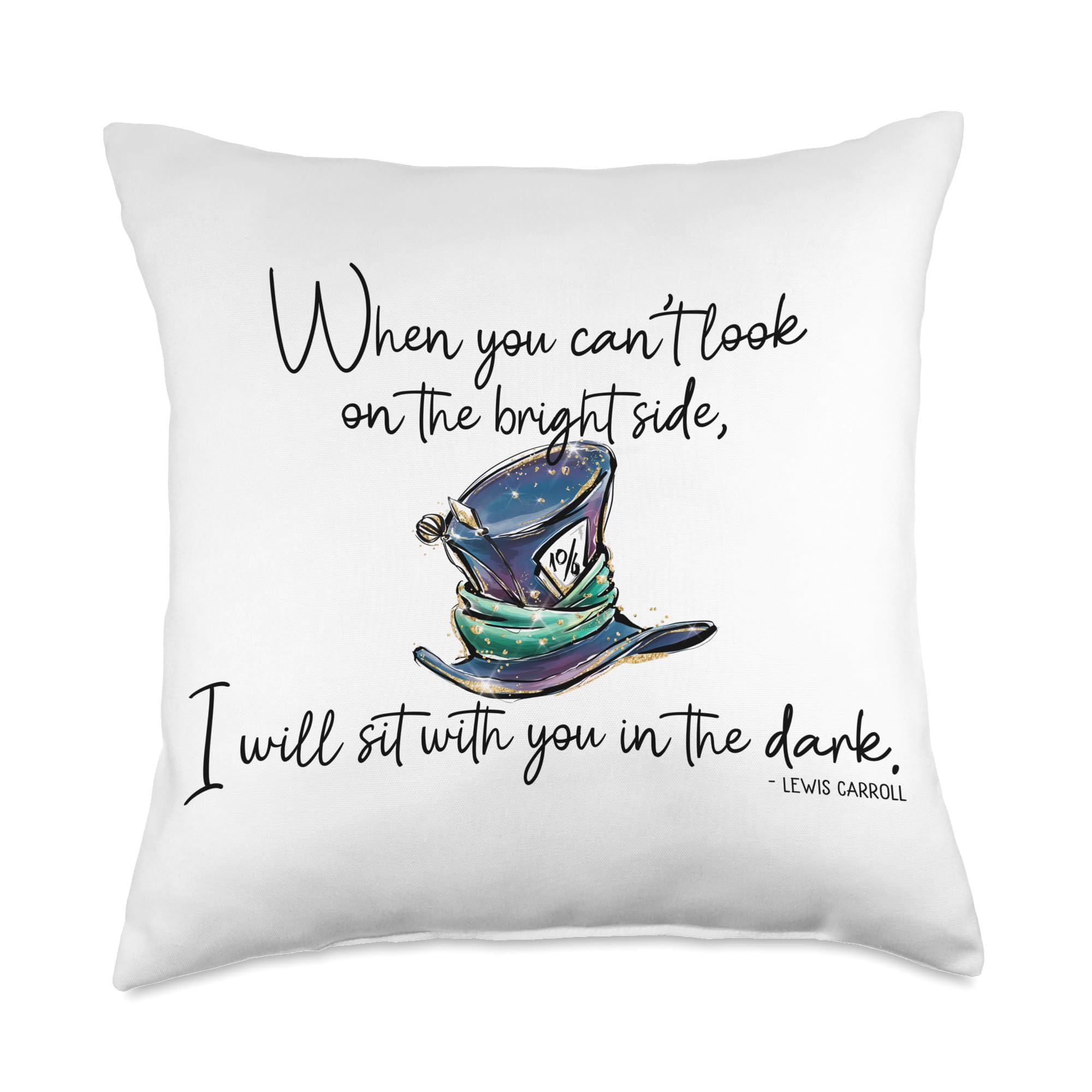 100% Polyester This design features the quote "When you can't look on the bright side I will sit with you in the dark." from the book Alice in Wonderland. This makes a great encouragement gift for anyone going through a rough time. 100% spun-polyester fabric Double-sided print Filled with 100% polyester and sewn closed Individually cut and sewn by hand Spot clean/dry clean only