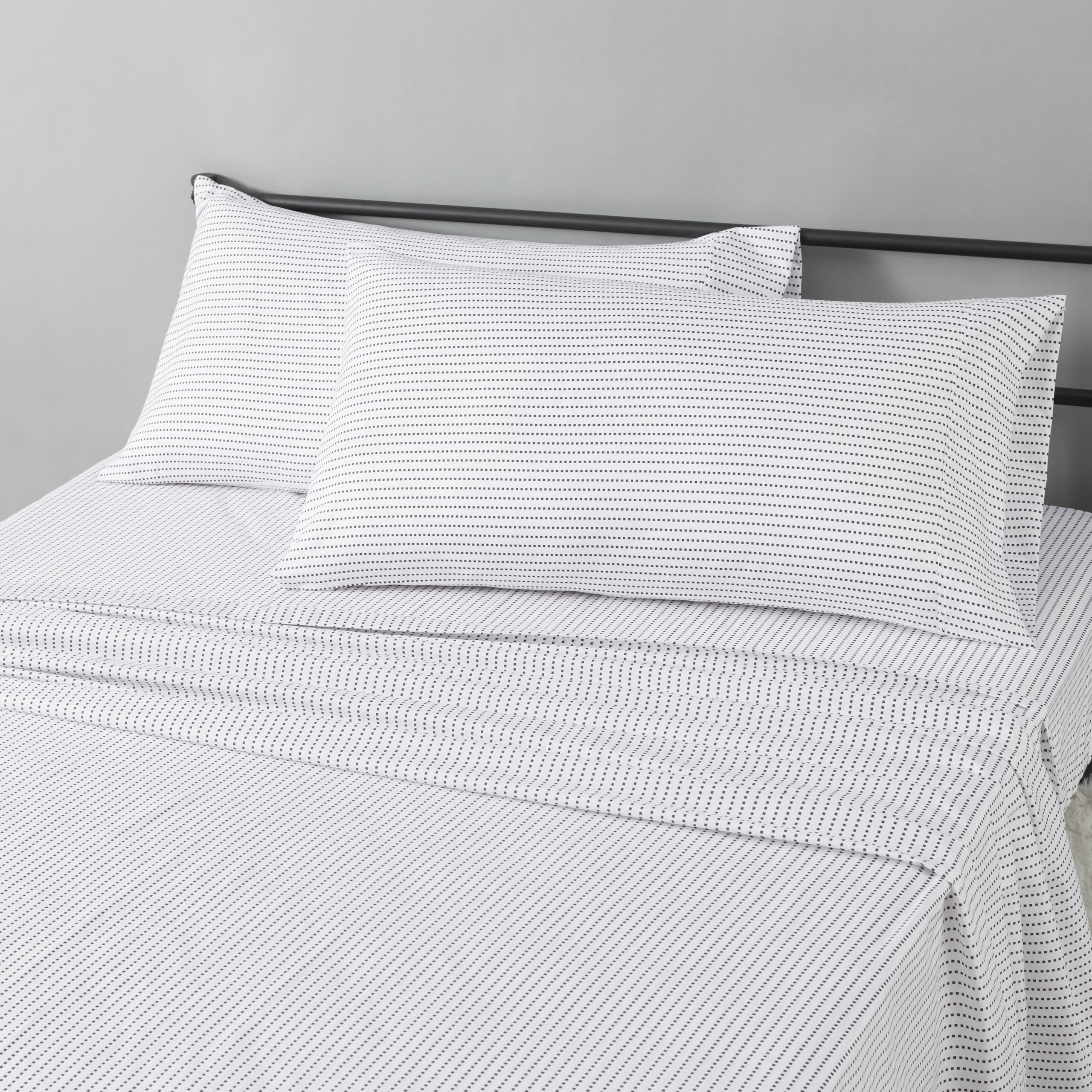 100% Polyester Imported Bed sheet set in a Plum print creates a cozy sleeping space 4-piece King-size set includes (1) 108 x 102-inch flat sheet, (1) 78 x 80 x 14-inch fitted sheet, and (2) 20 x 40-inch pillowcases Made of ultra-soft 120 GSM brushed polyester microfiber; strong, lightweight, and breathable for all-season comfort Machine washable and dryer safe; wrinkle and shrink resistant Made in OEKO-TEX Standard 100 factory, an independent certification system that ensures textiles meet high safety and environmental standards This product contains 55% Global Recycle Standard (GRS) certified recycled polyester