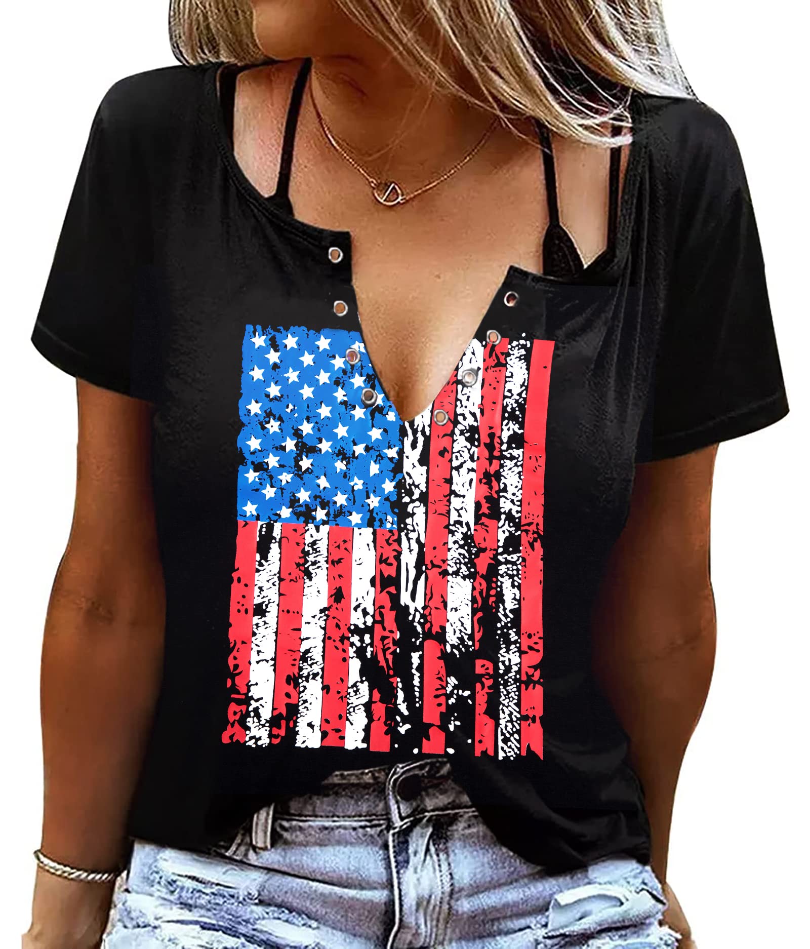 Women's 4th Of July Tshirt For Women Fashion American Flag Print T-shirt Patriotic V-neck Short Sleeves Independence Day Blouse