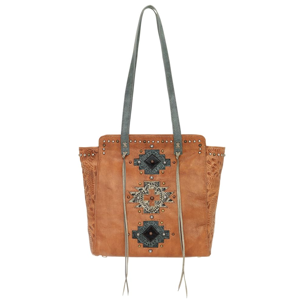 100% genuine leather exterior 100% cotton lining Hand-tooled & hand stained Dimensions: 11 x 12 x 4 American West Western Women's Handbag: Created in rich desert tones and finished in a hand-rubbed antique patina, this women's leather tote handbag will inspire the wandering soul. This Navajo Soul western zip top tote has multi-colored spots and cut-outs revealing layers of leather that enhance the vintage design and create dimension. Two pockets on the back are both large enough to accommodate large cell phones. Each handbag features cotton lining, an interior zip pocket, interior accessory pouches, and also includes a protective storage bag. Dimensions: 11 x 12 x 4"