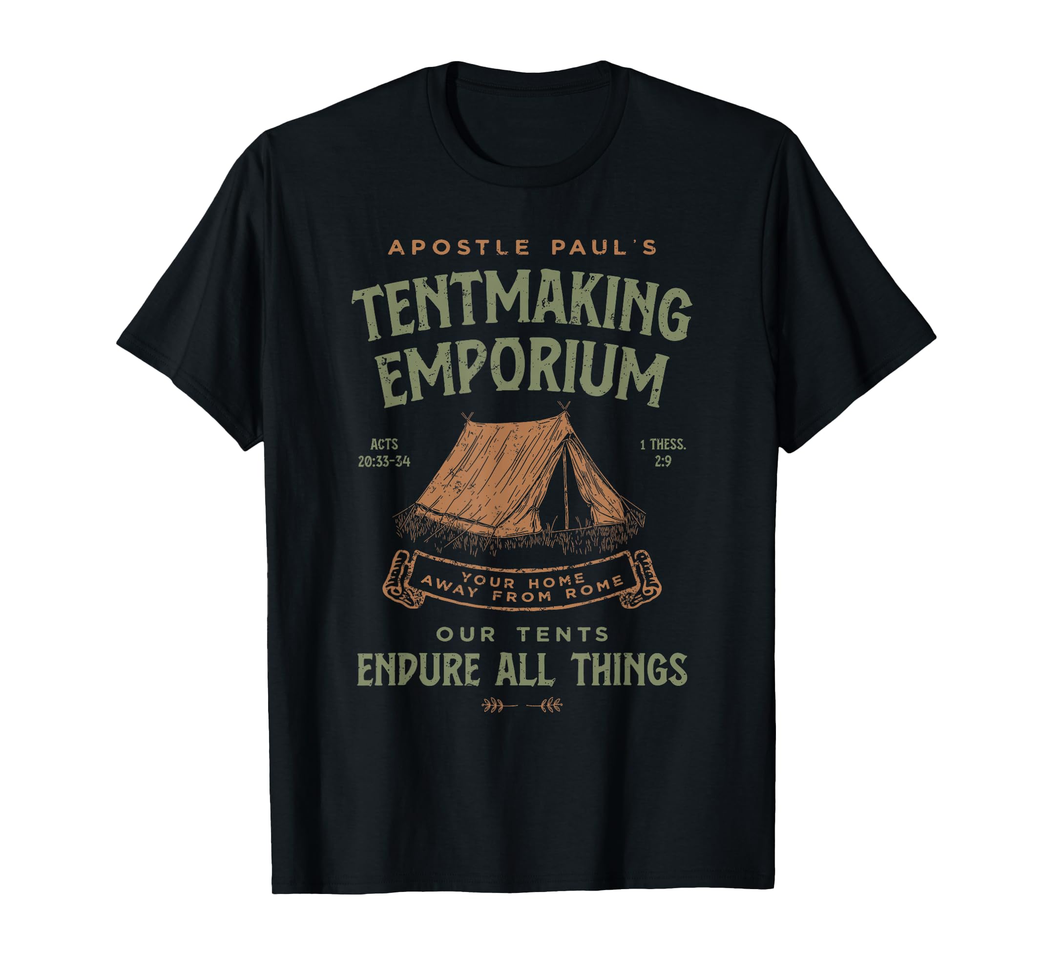 This funny Christian design says, "Apostle Paul's Tentmaking Emporium; Your Home Away From Rome; Our Tents Endure All Things." Great for any man who knows the mission and ministry of Paul and his Bible writings. View our brandname for more Bible quote designs for any Christian men. Use this as a funny way to express your Reformed theology: Salvation through faith in the grace of the cross of Jesus Christ. Lightweight, Classic fit, Double-needle sleeve and bottom hem