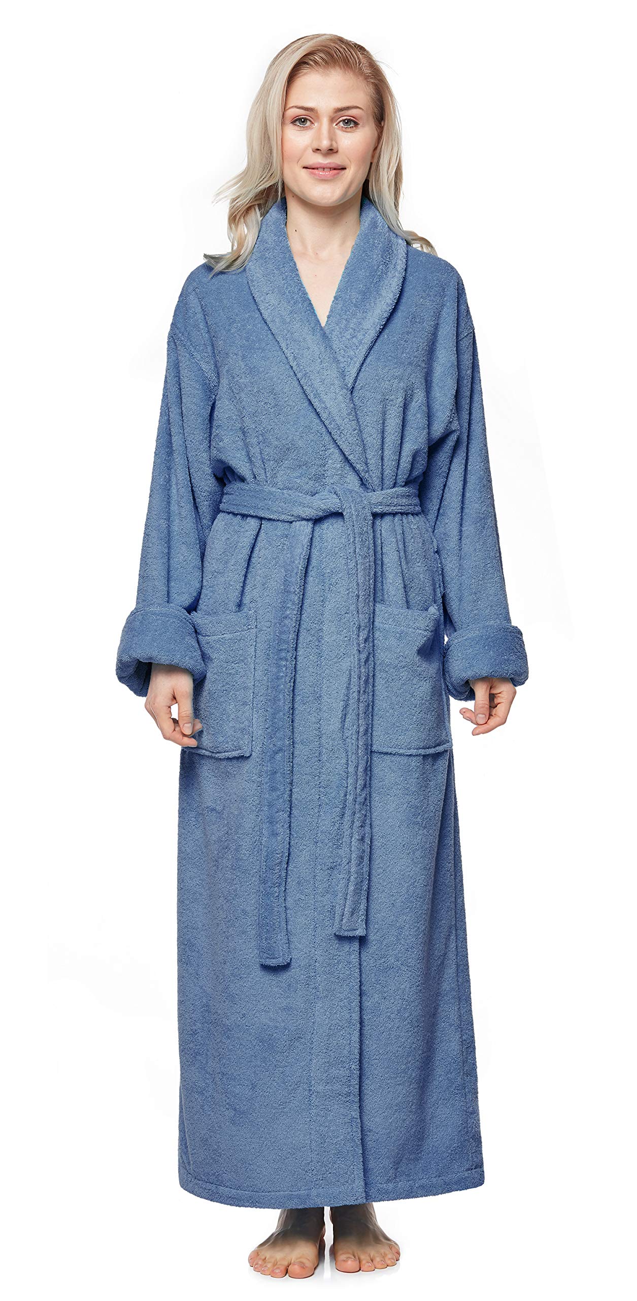 ANKLE LONG TERRY CLOTH BATH ROBE – This floor length Terry Cloth Cotton Women’s Robe with Shawl collar is designed for customers looking for a high quality true ankle length plush bathrobe made of Turkish cotton. You may wear it after shower, bath, sauna, hot tub, gym or pool. Manufactured from 100% high grade cotton with extra long fibers grown in the Aegean region in Turkey SOFT and BREATHABLE - Premium Cotton Terry construction with single ply loops on the inside and on the outside make it absorbent and gentle to your skin. It will get softer with each wash because of the quality of long staple Turkish Cotton MODEL- Tall Ankle Length Large Cut Tericloth Robe with length up to 57 inches. Wide cut shawl collar designed for comfort. It will absorb moisture with terry towel loops inside the robe. Patch pockets on both sides are ideal to keep your hands warm or to store your personal items. Self fabric belt with 2 belt loops will adjust to your preference. For matching Slippers, please search Amazon for "Arus Slippers" MULTIPURPOSE – This Plush Long Bathrobe for Women is a perfect gift for any occasion. Travel robe, vacation, dorm room essential to swimming and diving teams, you may use this luxury robe for your guests at home, give as an anniversary, wedding, bridesmaid or Christmas gift bathrobe on a special occasion, use as a house coat or simply enjoy for your own relaxation SIZING AND PRODUCT CARE - Sizes run large. Available in Sizes S - M - L and XL in Burgundy, White, Navy Marine, Plum and Blue Gray colors. Please refer to the Size Chart table below for detailed bathrobe measurements. Easy to care, we advise machine wash with like colors, tumble dry with low heat and no iron. You may wash your luxurious hotel quality bathrobe with other bath towels Women's terry robe ankle length Turkish Cotton Bathrobe. This terry cloth robe is designed for customers looking for a high quality full length long bathrobe made of premium Turkish cotton. Manufactured from terry cotton with longest fibers grown in the Aegean region, it is terrycotton on the inside and on the outside, providing unmatched absorbency of Turkish toweling. This bathrobe with shawl collar has patch pockets on both sides.