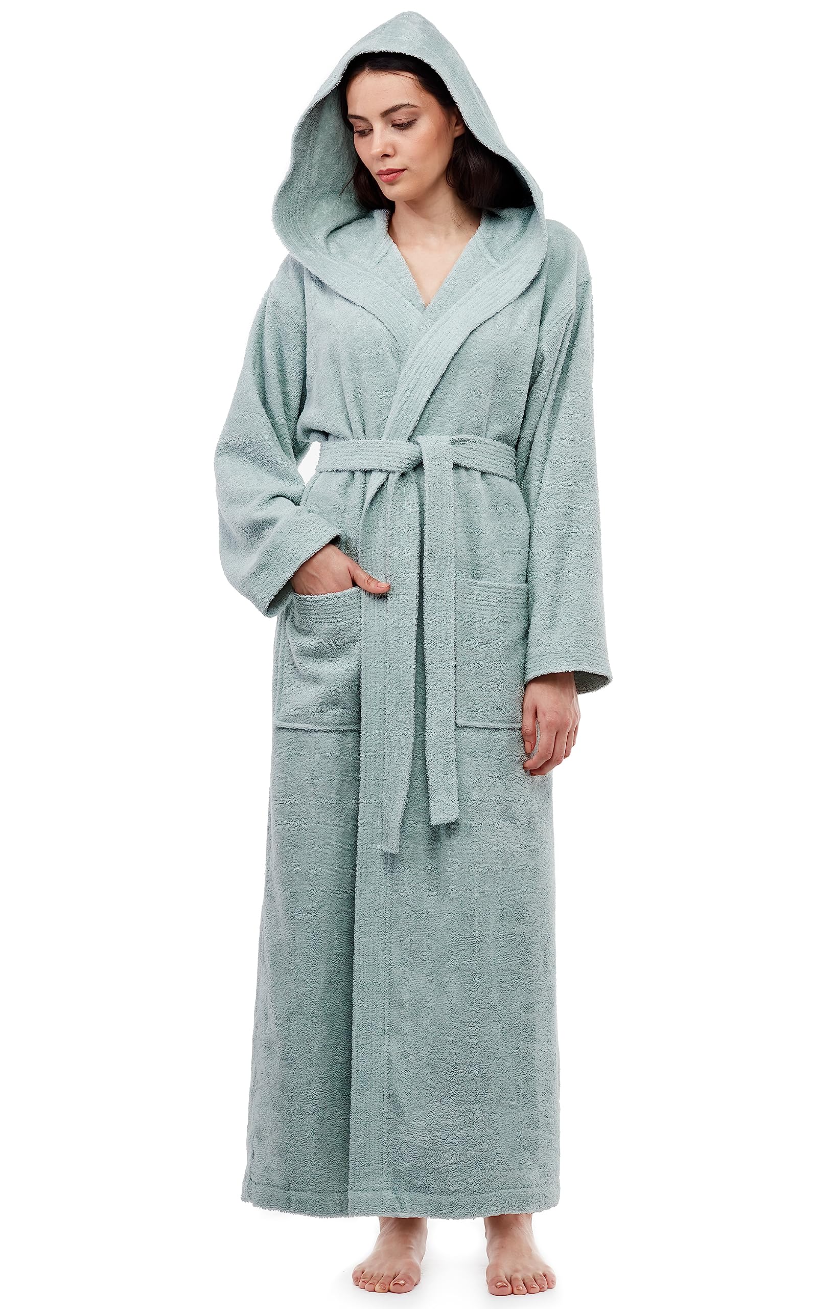 Ladies adult hooded premium cotton full length floor long tall terrycloth bathrobe. 100 percent cotton construction. This soft bath gown can be used as a cotton maternity robe, nursing robe, bridesmaid’s gift, travel robe, sleep robe at night, pajama bed jacket robe, housecoat robe, hot tub robe, swimming robe at pool or beach, sauna robe.