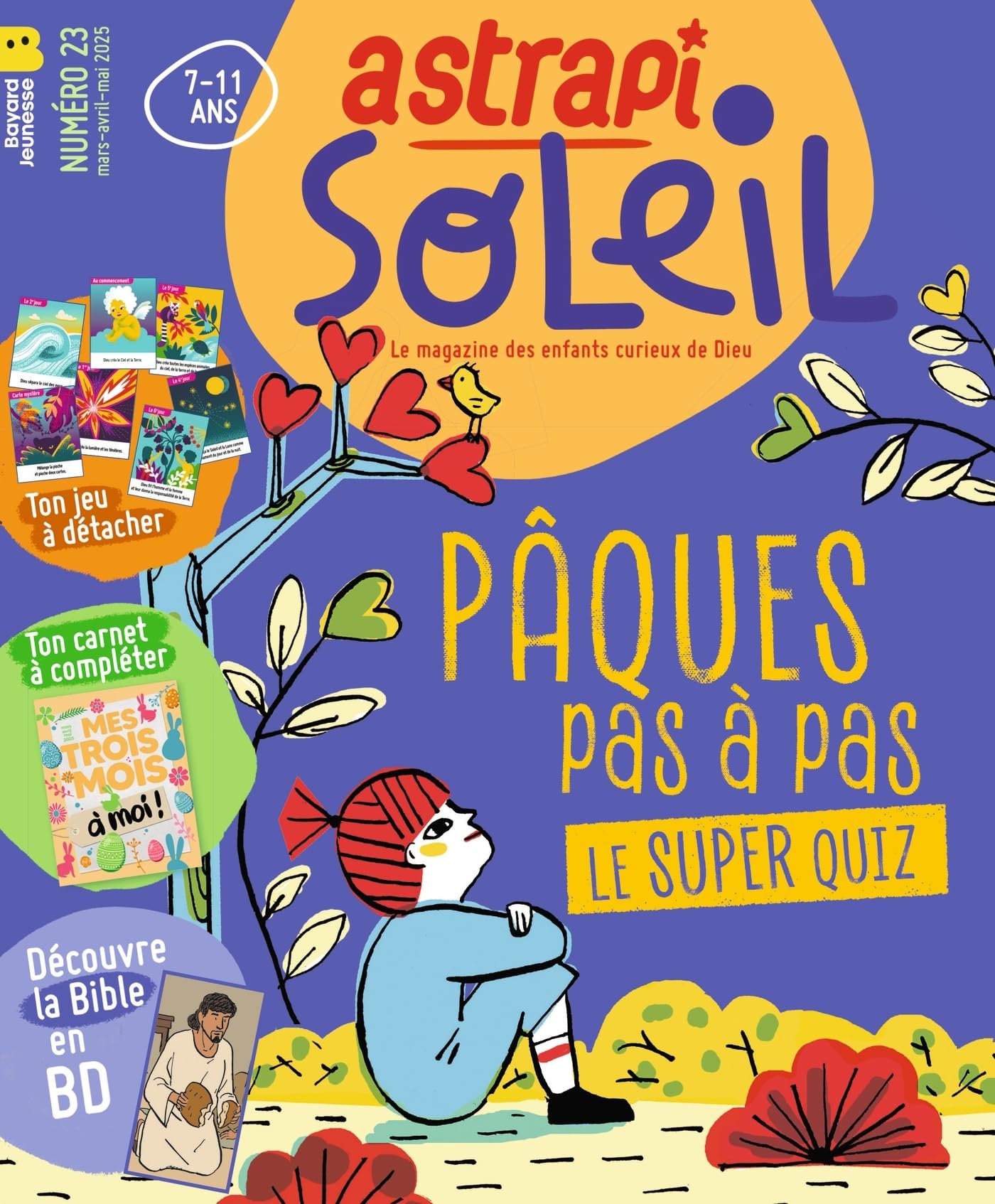 Tous les trois mois, le magazine Astrapi Soleil vient à la rencontre des enfants de 7 à 11 ans curieux de Dieu ; répond à toutes leurs questions, même les plus complexes et leur permet une découverte intelligente et sensible du christianisme, à travers différents formats (jeux, BD, actus, brico) qui font appel à la tête et aux mains ! Le magazine est composé de 5 éléments : -Des pages d'actu : avec des dates clés, des fêtes ancrées dans l'actualité des enfants -30 pages de BD : avec un épisode de l'Ancien Testament, un récit de la vie de Jésus et la vie d'une figure inspirante. -Des questions : et des pistes de réponses aux questions existentielles et culturelles des enfants pour les accompagner dans leur quête et leur compréhension du monde. -Un jeu de plateau : pour jouer en famille ! -Un carnet personnel à lire, remplir et graphiter soi-même Deux fois par an, des numéros 100% BD sur des vies de personnalités engagées et solidaires. Un rendez-vous complice, ludique et documenté, pour donner aux enfants des pistes et des repères dans l'anthropologie chrétienne.