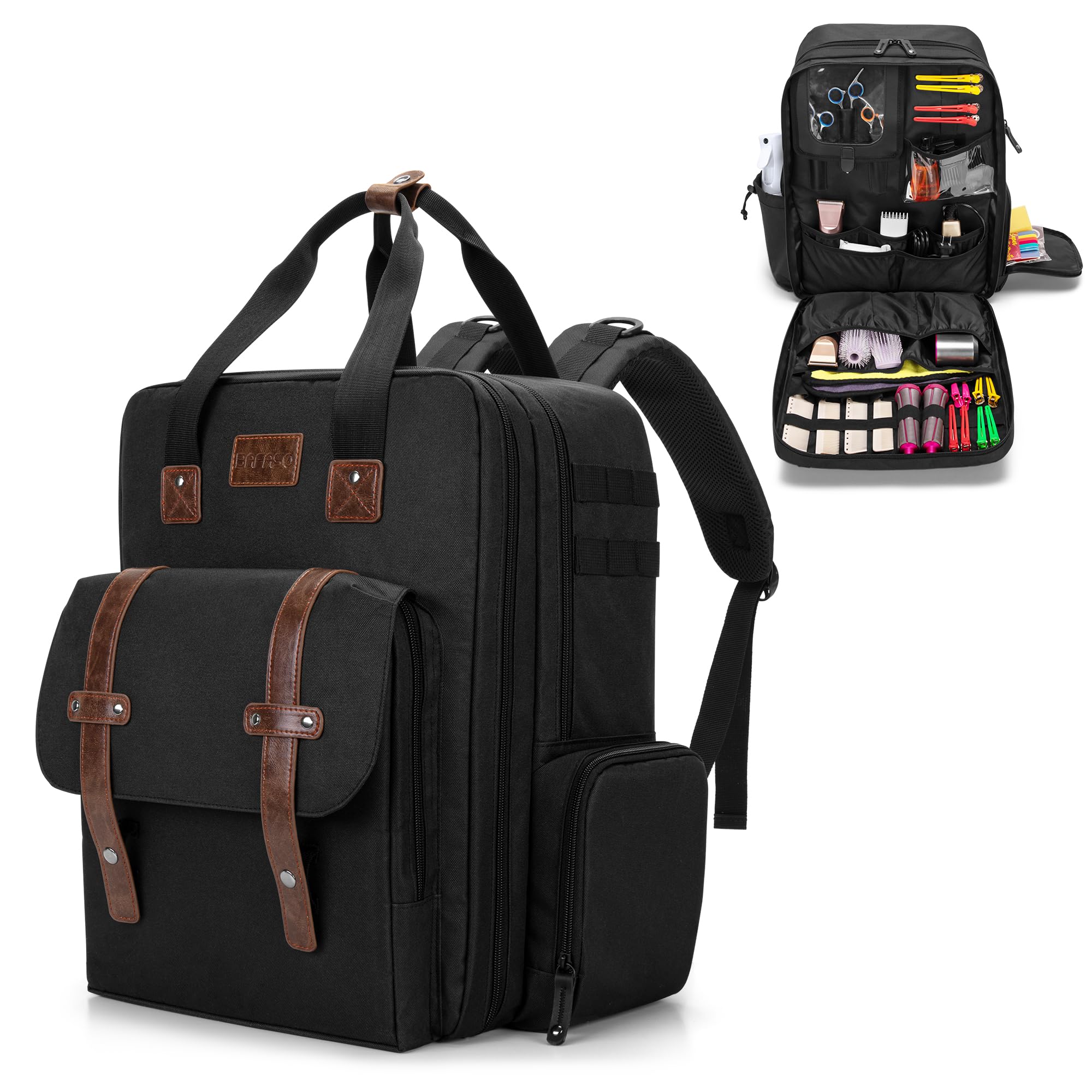 EXCELLENT QUALITY - This travel barber case is made of heavy duty nylon. Thick inner padding provides nice protection for hair cutting supplies. FRONT COMPARTMENT - The front compartments with a wide range of functions. 3 dedicated slots for keeping shears. 9 individual pockets for tools like hair clippers (wireless & corded) and clippers guards. Several elastic bands and slots to secure combs, hair clips and the like. MAIN COMPARTMENT - The main section with 5 pockets (2 mesh & 1 transparent & 2 nylon) can store large tools like hairdryer and straightener. A large padded sleeve can hold a 15.6" laptop. OTHER POCKETS - The outermost zipper part with several slots and pockets provide additional space for keeping hair scissors and small tools. 2 side pocket to hold other supplies (The pouch with an adjustable string is designed for putting a spray bottle). Pocket in the back is convenient too. COMFORTABLE & STYLISH DESIGN - Great look with leather accent straps. The breathable padded back side and shoulder straps make you feel more comfortable. Dimensions: 12" x 8.5" x 17". BAFASO Large Capacity Barber Case