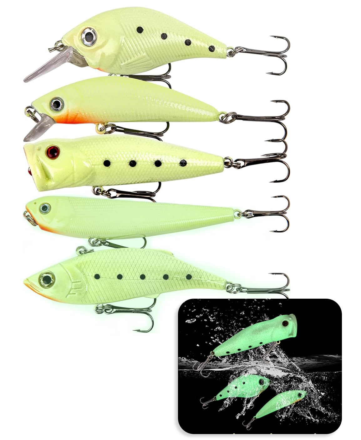 GLOW IN THE DARK FISHING LURES: Provide 5 different styles of glow fishing lures, vib, popper fishing lure, crankbait, minnow, pencil. These bass fishing lure with multi-layer reflective finish and 3d realistic eyes to attract curious fish. Takes a light to energize it, then the top water lures will glow brightly. Very suitable for night fishing. REALISTIC ACTIONS: The lead weight on the belly of the swimbait provides extra weight, control barycenter easily. Produce realistic movements and special noises which can effectively attract predators' attention. Can hook fish firmly once they bite these crank baits for bass fishing. HIGH QUALITIES: Made of high-quality materials. Each fishing lures bass is equipped with 2 rust-proof sharp trident hooks with excellent piercing ability and strong wear resistance. Super sharp needle points and barbs, effectively prevent fish from escaping. WIDELY FISHING SPECIES: Can be used as fishing lures for freshwater and saltwater fishing lures. Widely used to catch bass, catfish, walleye, pike, muskie, crappie, perch, snook etc. This bass fishing kit is perfect for boat fishing, lake fishing, stream, pond and river fishing. Take your bass fishing game to the next level. PERFECT GITE: Fishing lure kit with tackle box. Easy to store and carry. Fish bait is a great gift idea for a parent or friend who enjoys fishing, and it's especially appropriate for holidays like father's day, thanksgiving, and christmas. Provide 5 different glow in the dark types of bass fishing lure with 2 rust-proof sharp trident hooks with excellent piercing ability and strong wear resistance. With a tackle box. Easy to store and carry. night fishing gear glow in the dark fishing rod glow in the dark fishing bass fishing glide bait swimbait lures fish hooks swim bait bass bait trout bait topwater bass lures weedless fishing lures power bait trout bait trout fishing bass lure crank baits for bass fishing popper fishing lure bass lures freshwater swim baits power bait trout bait fishing lures kit trout fishing lures trout fishing saltwater lures fishing baits bass lure bluegill bait crank bait fishing bait kit swimbaits for bass fishing crankbaits for bass fishing funny fishing lures fish lures striped bass fishing lures saltwater fishing hooks best fishing lures fishing lure set wopper plopper bass baits crank baits señuelos de pesca agua salada whooper plopper bass fishing bait trout lure bass fishing tackle lipless crankbaits for bass fishing largemouth bass fishing lures bass topwater lures baits lures for bass trout lures for lake fishing whopper popper fishing lures top water top water popper topwater lure poppers fishing lures saltwater lures for fishing bass fishing lures for freshwater top water lure top water poppers bass fishing lures fish lure fishing lures set fishing bass lures striped bass lures rat lures for bass fishing topwater popper perch lures lure top water bass lures fake bait giant fishing lure river fishing lures freshwater lures bass fishing topwater lures fishing lures for trout best fishing lures for bass fishing lures freshwater fish lures for bass shad lure tarpon lures best bass lures shad fishing lures top water baits whopper flopper bass lure set top lures for bass fishing fresh water fishing lures top water bass fishing lures kit whopper fishing top water lures fresh water lures for fishing hard baits fishing lures best selling fishing lures best trout lures