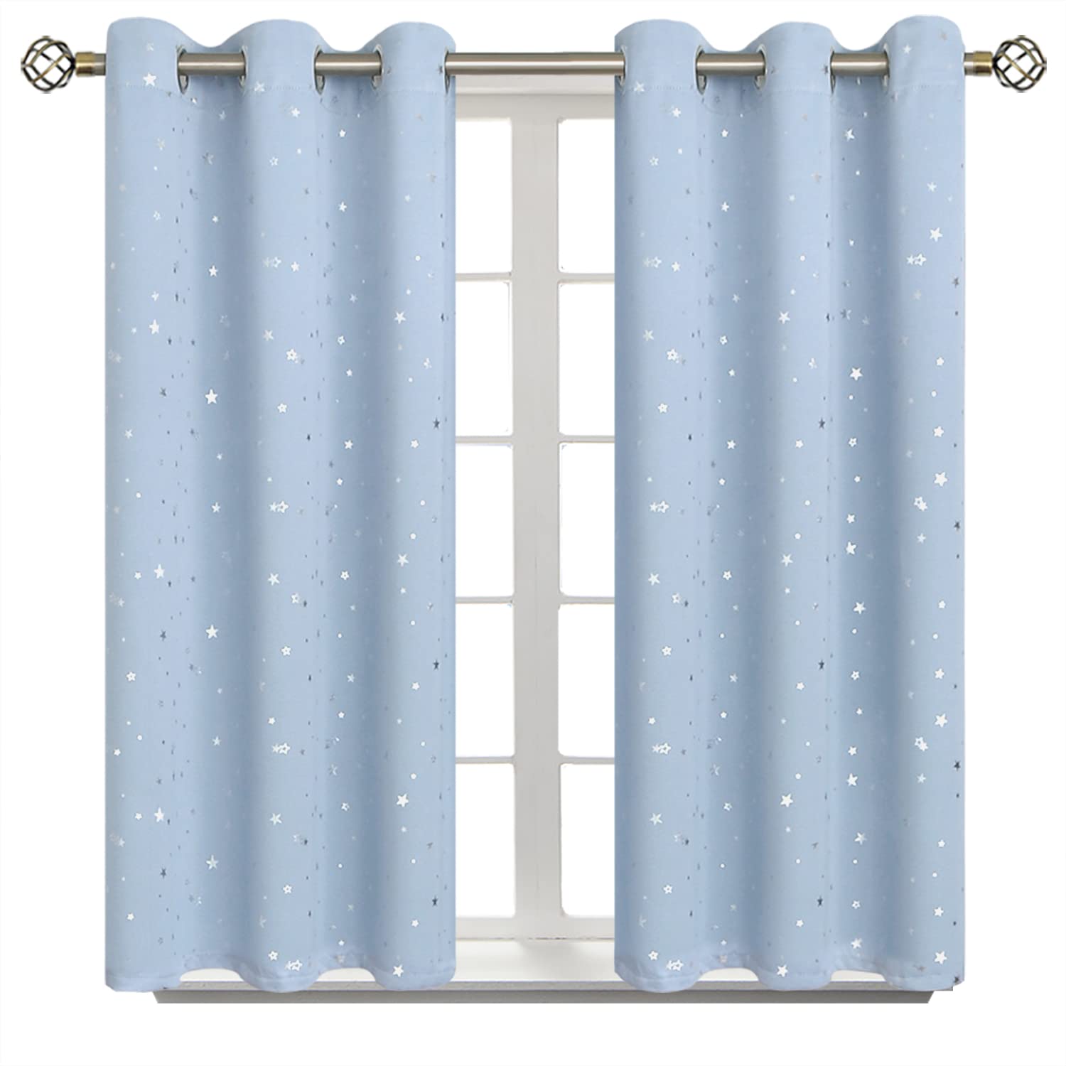 Polyester Package Includes: Set of 2 baby blue kids curtains; Each panel measures 42 Inch wide by 45 Inch long. Each star curtain panel has 6 silver metal grommets which inner diameter is 1.6 inch, comparable with most rods. Easy to hang, and slide smoothly. Vivid Star Pattern: The silver star foil print on the BGment blackout curtains provides a unique appearance that looks stunning under the light to add fun and cute to the kids room. Ideal for bedroom, baby room, boy's room, girl's room, nursery, etc. Room Darkening and Privacy Protection: With our bedroom curtains, you can weaken harsh sunlight (Darker colors work better), which is ideal for baby sleep and afternoon naps. With these room darkening curtains, you can create a dark sleeping environment while providing you with a very private space. Thermal Insulated: Our energy saving curtains insulate against summer heat and winter chill to balance your room temperature, cut down energy bills. These room curtains also prevent damage to furniture and floors caused by direct sunlight. Size Recommendation: The total width of the curtain be at least 2 times the total width of the window, and the length of the curtain is greater than the length of the window. Please measure your window’s size before purchasing, or contacting us to know the suitable curtains’ size.