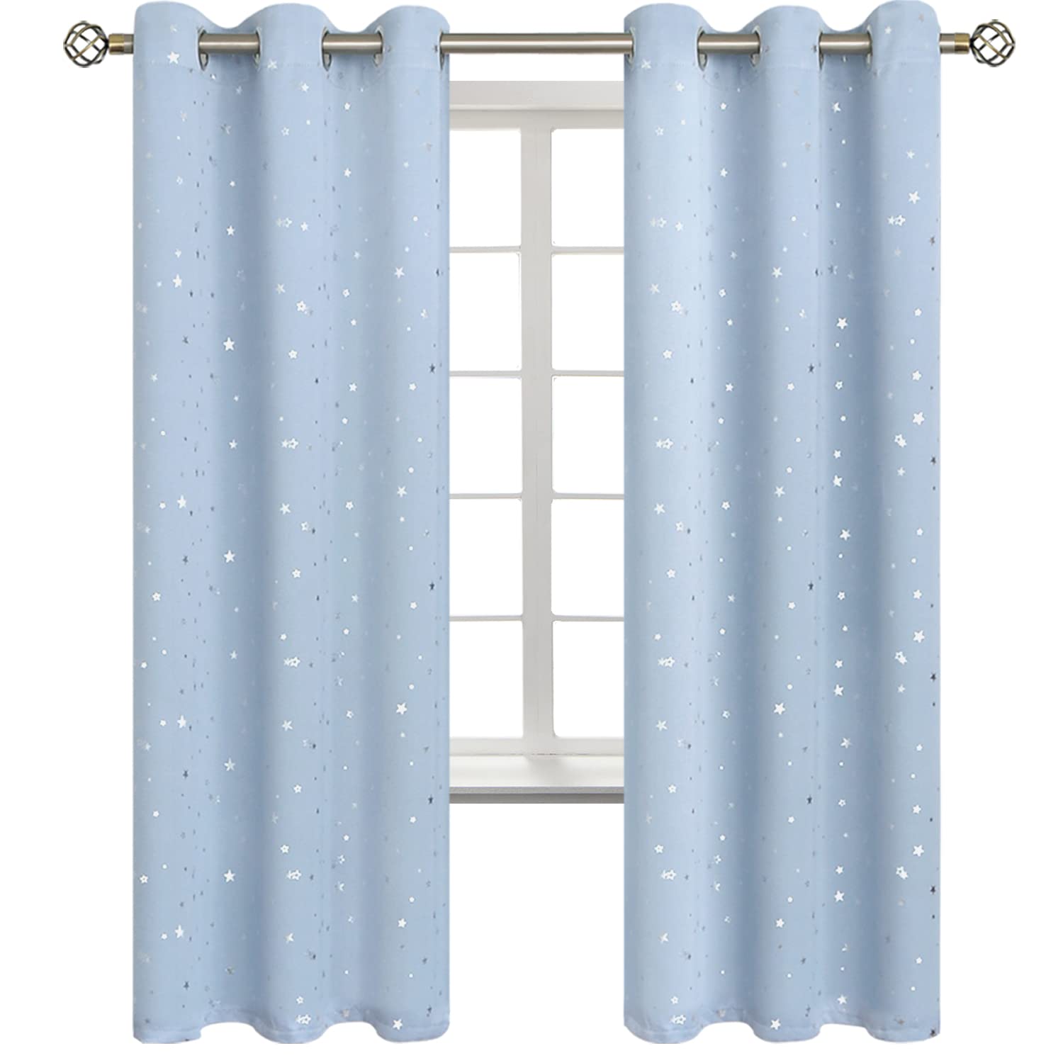 Polyester Package Includes: Set of 2 baby blue kids curtains; Each panel measures 42 Inch wide by 72 Inch long. Each star curtain panel has 6 silver metal grommets which inner diameter is 1.6 inch, comparable with most rods. Easy to hang, and slide smoothly. Vivid Star Pattern: The silver star foil print on the BGment blackout curtains provides a unique appearance that looks stunning under the light to add fun and cute to the kids room. Ideal for bedroom, baby room, boy's room, girl's room, nursery, etc. Room Darkening and Privacy Protection: With our bedroom curtains, you can weaken harsh sunlight (Darker colors work better), which is ideal for baby sleep and afternoon naps. With these room darkening curtains, you can create a dark sleeping environment while providing you with a very private space. Thermal Insulated: Our energy saving curtains insulate against summer heat and winter chill to balance your room temperature, cut down energy bills. These room curtains also prevent damage to furniture and floors caused by direct sunlight. Size Recommendation: The total width of the curtain be at least 2 times the total width of the window, and the length of the curtain is greater than the length of the window. Please measure your window’s size before purchasing, or contacting us to know the suitable curtains’ size.