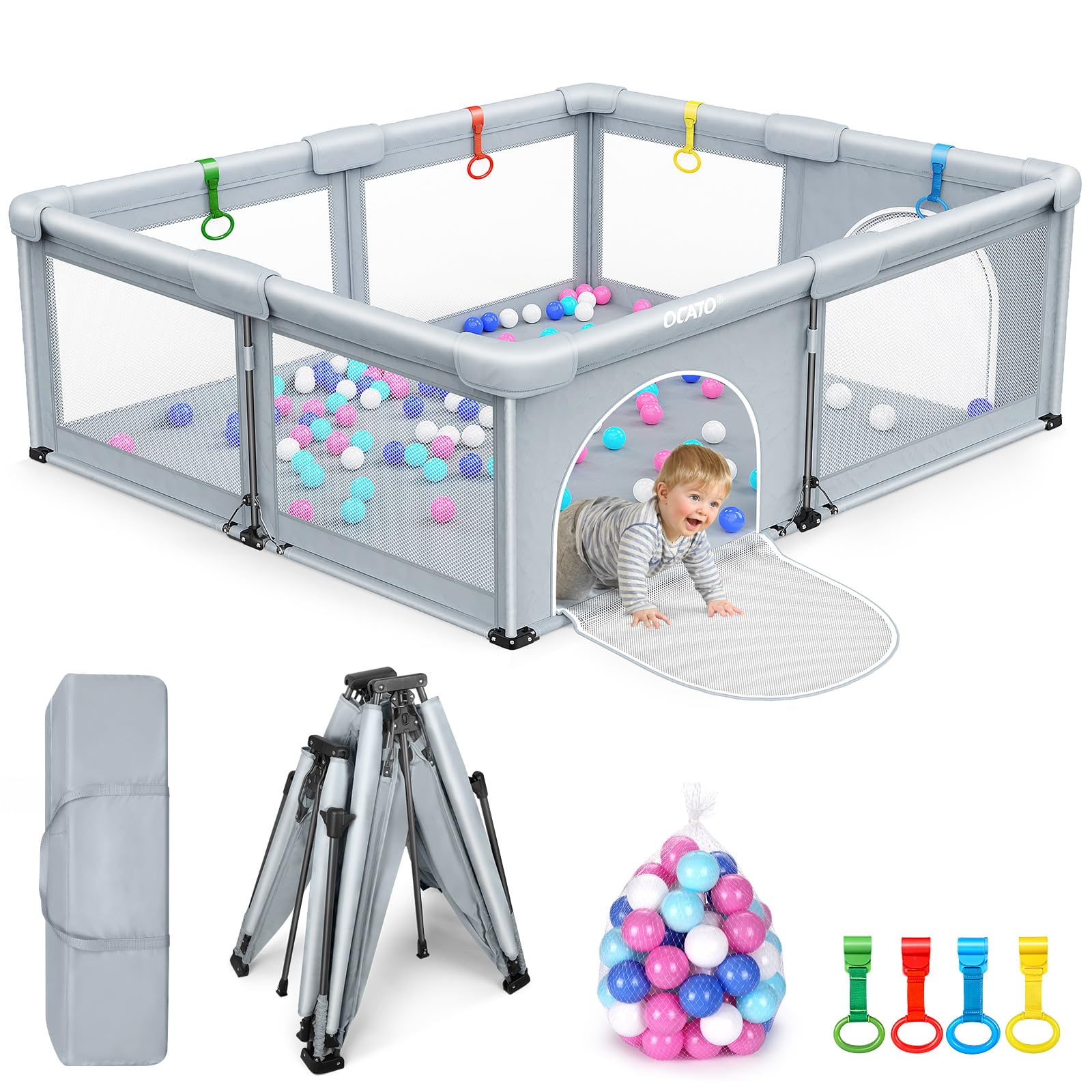 ALMOST ONE STEP FOLDING: Absolutely recommend OCATO baby playpen as baby gifts! Setting it up was a breeze, thanks to its quick and effortless installation. Only about 2 cubic feet when folded, foldable playpen is easy to store in a small room at home, and carry in the trunk of a car. As parents who are always on the go, baby play pen are very great for parents to carry everywhere. With this integrated playpen for babies and toddlers, you can do it all by yourself NEW SPECIAL ACCESSORIES: New upgraded baby gate playpen. Our playpen for toddlers added ocean ball x50, hanging ring x4, storage bag x1, storage strap x2. When the mom is busy, the baby can practice standing and walking through the hang ring, perfect size and height for babys to grip. Bright ball catches baby‘s attention, great entertaining extra large playpen for toddlers SAFE RELIABLE DESIGN: Toddler playpen made by encrypted 300D Oxford cloth material, easy to clean, safe and skin-friendly, BPA free. Babies can lie and play on play yard, even if he is naked. All around triangular structure, which has been tested 8000 times in a third-party laboratory, meet ASTM requirements. A height of 27” prevents the baby from climbing out of the portable playpen. No more cry! No more risk! Great toddler gifts play pen for babies 6-12 months ever NON-SLIP ON ANY FLOOR: Non-slip base provides further stability. Suitable for any floor, such as wood, carpet, grass, marble, etc. Baby play yards maintain stability when baby is excited. For indoor and outdoor use, including home, park, grassland, beach. Spacious outdoor baby playpen that can accommodate multiple toddlers and parents. A quick pop up and lock system, four sizes complete, great play pen for toddlers 1-3 years, amazing chose for new parent EXPANSIVE BABY PLAY AREA: Ventilated and breathable mesh wall around, 360° viewing Angle, provide a good view. Mom can interact with the baby, give baby enough security, perfect for parent-child interaction. External zipper to prevent the baby from climbing out of baby playpen foldable. Play yard for baby is completely wrapped with soft cloth, no exposed gaps. It has plenty of room for little ones to crawl, walk, play, explore. Free mom's hands and relax Why choose OCATO Baby Playpen?