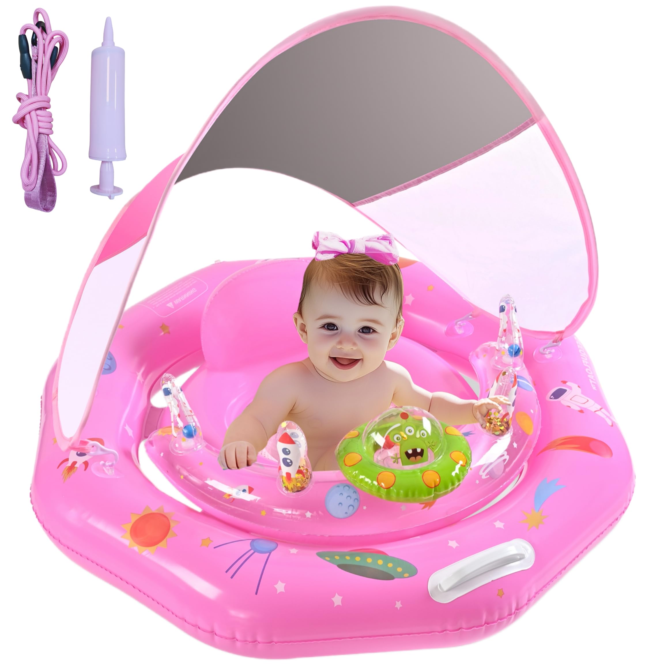 1.【UPF50+ SUN PROTECTION】GEEQUFLOAT's Baby Pool Floats are the Perfect Summer Gifts for Babies! They Come with a Removable UPF50+ Sun Protection Canopy to Keep Your Little one's Delicate Skin Safe and Sound. 2.【EXTRA WIDE AIR CHAMBER NEVER FLIPS OVER】GEEQUFLOAT's Toddler Floaties are Lovingly Designed with a Super-wide Double-ring Air Chamber That's Built to Never Flip Over. We're Here to Make Sure Your Little One's Safe and Sound! 3.【SAFETY HANDLE AND LEASH DESIGN】 GEEQUFLOAT's pool float for 1 year old has added a safety handle and a safety leash, which helps to enhance the interaction between baby and mom and dad for a wonderful bonding time, and baby is safer! 4.【FUNNY TOY CONSOLE】 Your Little One will Just Love This Baby Pool Float with Canopy! It has the Most Adorable Spaceship & Rocket Toys on the Surface of the Inflatable Pool Floats, All to Encourage Your Baby's Sensory Development and to Make Funny Noises When You Press Them.This will Help Your Baby to Become Less Afraid of Water! 5.【BABY FRIENDLY MATERIALS】Our Baby Swim Floats are Made From Durable, Leak-proof PVC Material, Which is 100% Safe and Non-toxic. We are Proud to Say That They Meet the Most Stringent and Highest International Toy Safety Standard, CPC Certification. And They are Kind to Your Baby's Skin Too! 6.【WARM TIPS】We Really want You to Have Fun with Your Toddler Pool Float, But it's Important to Remember that it's not a Professional Life-saving Device. To Keep Everyone Safe and Sound, It's Best to Have a Guardian with You When Your Little One is Using it. To Make Sure it's Always Perfectly Inflated, Just Keep an Eye on the Level of Saturation and Make Sure it's at About 90%-95%!(The Inner Wall of the Air Ring Should Have No Obvious Big Wrinkles) 7.【ADJUSTABLE SEAT BUCKET】GEEQUFLOAT's Baby Floaties 6-12 months Come with a Super-comfy, Soft Fabric Seat Buckle that Can be Easily Adjusted to Fit Your Little one's Height Perfectly. This Gives Your Baby the Best, Most Enjoyable Water Play Experience, And Helps Them Feel Confident and Comfortable in the Water. Hey, We're So Excited to Introduce GEEQUFLOAT's Amazing Baby Swim Float! It's the Perfect Companion for Your Little One's Water Adventures, And We've Designed it with the Utmost Care and Attention to Make Sure it's Super Safe, Comfortable, And a Total Joy for Your Little One. This Toddler Foaties is a Must-have Summer Gifts for All You Amazing Parents Looking to Introduce Your Babies to the Joys of Swimming. Made Especially for Little Ones Aged 6-36 months, Our Floaties for Toddlers1-2 is a Secure and Enjoyable Way for Your Little Bundle of Joy to Experience the Water.We've Crafted it with High-Quality Materials, So You Can be Bure it's Durable and Sturdy, So Your Baby will be Comfortable and Stable while They're Having Fun. The Soft Fabric Gently Cradles Your Little One, Providing a Cozy and Comfortable Seating Position. And We Haven't Forgotten about Sun Safety! Our Special Built-in UPF50+ Sun Canopy is Removable, So You Can Keep Your Little One Safe and Sound. The Canopy is Easy to Assemble and Remove, So You Can Shield Your Little One From the Sun Whenever You Need to.We've Made Safety a top Priority with Our Baby Swimming Float. It has Secure Straps and Buckles to Keep Your Baby in Place, So You don't Have to Worry about Them Slipping or Flipping Over. The Float is Extra Wide and Stable, So it's Less Likely to Tip Over. Whether You're Jetting off to the Beach, The Pool, Or Just Enjoying Some Quality Time in Your Backyard, Our Baby Float with Canopy is Compact and Lightweight, Making it Ideal for Travel. It Inflates and Deflates Quickly, So You Can Easily Store and Transport it. With its Vibrant Colours and Adorable Design, It's Sure to Capture Your Baby's Attention and Make Their Swimming Sessions even more Enjoyable. You Can Count on our Baby Pool Float with Canopy to be a Reliable and Fun Aquatic Accessory for Your Little One. Let Them Splash and Play in the Water while Ensuring their Safety and Comfort at all Times.But Never Take Your Eyes off Your Child, of Course!