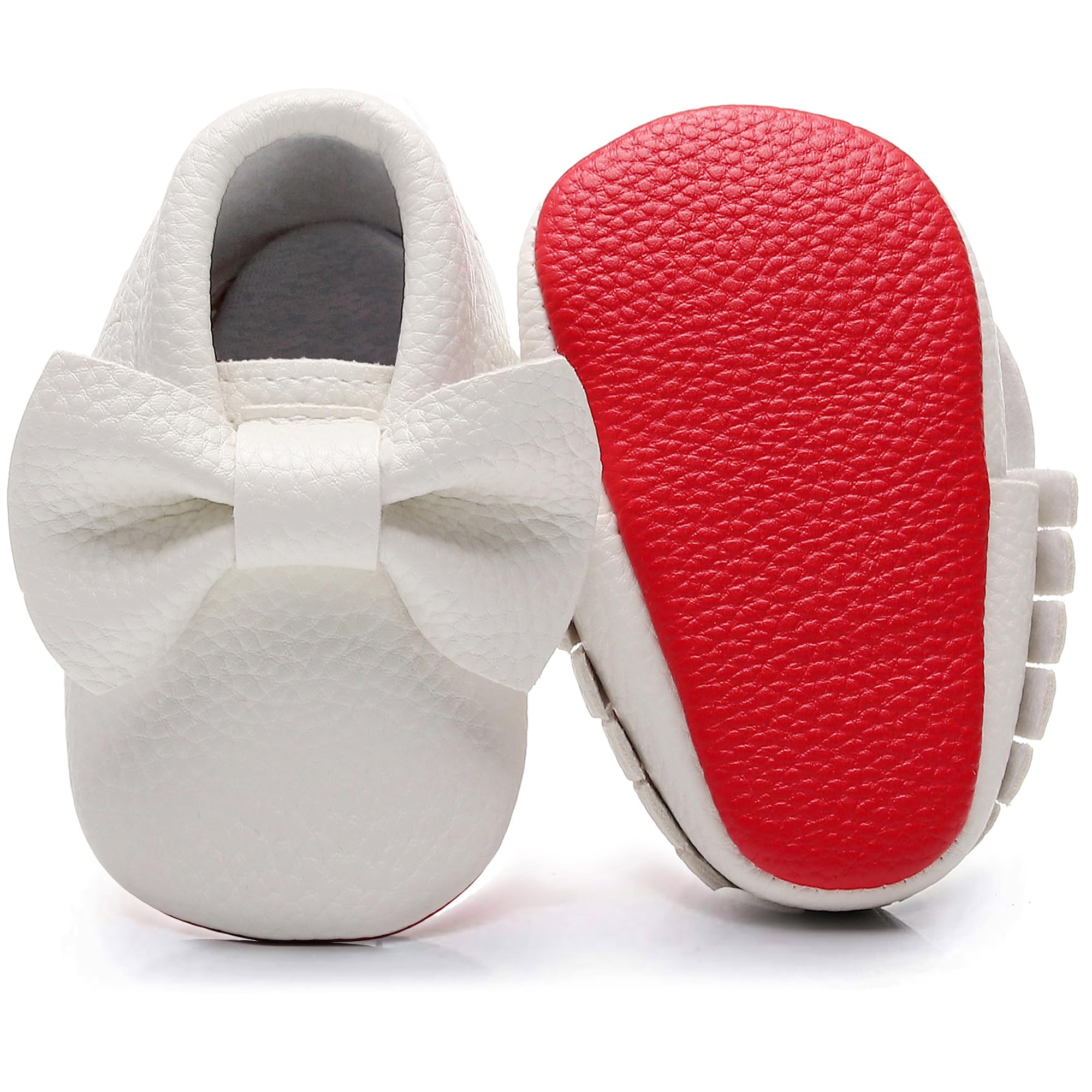 MATERIAL: Stylish cute bow Baby moccasins, 100% handmade high quality PU leather baby shoes with durable bottom. Lightweight and soft leather Sole is well-crafted to make walking feel natural. Easy on,Easy off. An hidden Elastic band that wraps around ankle which keeps them stay on baby feet. DESIGNS: Lots of classic colors avaivable. Baby girls shoes with big bowknot and Fringe suit both baby girls and baby boys. OCCASINS: Perfect gifts for baby, toddlers, first walkers, fit for 0-24 months angel. Great for indoor outdoor activity, formal and informal occasions, like Christening Baptism, playdates, or even just lounging around the house! SIZE: Please do measure your baby's feet length first and choose your shoes size refer to our Size Chart , the age range and US size are just for references. Promise - If any quality problems with our baby moccasins, you‘re welcome to return it for a replacement pair or complete refund. Your happy shopping experience and satisfaction are our aim, we will do it better with you encouragement. Very beautiful fashionable and flexible baby girls moccasins shoes