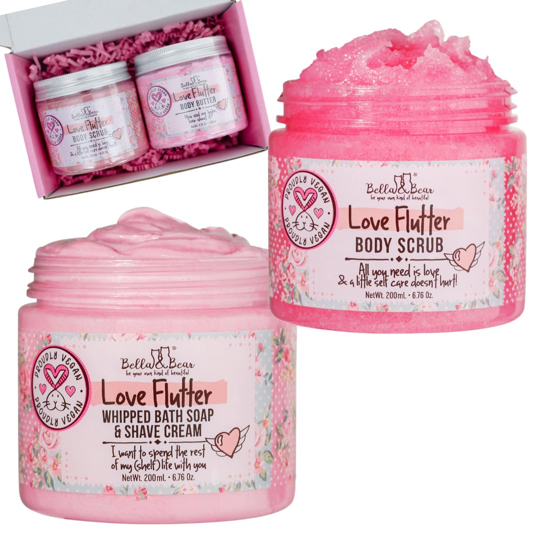 Pampering Duo: Transform her self-care routine with our luxurious body scrub and indulgent body butter, designed to leave her skin irresistibly smooth and radiant. Delightful Scent: Infused with a delightful Berry Candy fragrance, our set adds a sweet touch to her pampering sessions, making every moment a charming escape. Cruelty-Free & Vegan: Enjoy peace of mind knowing that our gift set is 100% cruelty-free and vegan, perfect for the environmentally conscious lover who believes in beauty without compromise. Thoughtful Gift Packaging: Arrives in an adorable pink box ready for gifting, making it an ideal surprise. Great Gifts for Women Birthdays, Girlfriends, Bridesmaids Home Spa Experience: Encourage her to unwind and relax with a spa day at home, delivering laughter, love, and silky smooth skin with every use—because she deserves the best! Surprise your girlfriend this Valentine’s Day with our Love Flutter Gift Set—because nothing says “I love you” quite like scrubbing away the stress of everyday life! This cheeky duo includes a body scrub that’ll make her feel like a smooth-talking superstar and body butter so luscious, she might just take a moment to swoon with the Berry Candy scent this product is sweet like your sweet:) Packaged with a wink and a smile and in a cute pink box, this cruelty-free and vegan set is perfect for the environmentally conscious lover who appreciates beauty without the guilt. Who knew pampering could be so guilt-free? Treat her to a spa day at home because let's face it, you can't put a price on relaxation… but you can wrap it up in a cute package! Ideal for Valentine’s Day or any day you want to sweeten her deal—because if she’s got to deal with your puns, she deserves the best in self-care! Give the gift of love, laughter, and silky smooth skin with the Love Flutter Gift Set!