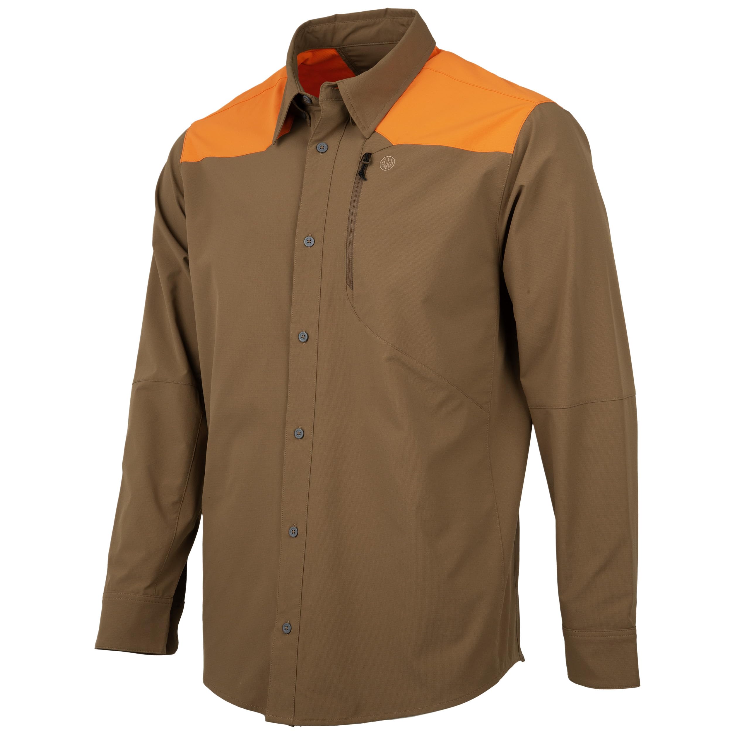 TECH SHIRT FOR MEN - The BERETTA Men's Ozark Tech Shirt is a purpose-built garment designed for rugged outdoor use, combining performance-driven materials with thoughtful design to meet the demands of hunting, hiking, or everyday fieldwear REAR CAPE VENT - The rear cape vent provides breathability and airflow, especially important when worn during high-movement activities like upland bird hunting; combined with the field shirt's lightweight construction, it helps maintain a cool, dry feel all day DESIGN & VISIBILITY - This hunting shirt makes a statement with its classic field body and high-visibility blaze orange accents across the shoulders and upper back; orange panels enhance visibility during hunting trips or outdoor activities in wooded or brush-covered terrain FUNCTIONAL SHIRT - The BERETTA Men's Ozark Tech Shirt features an athletic yet relaxed fit; a zippered chest pocket offers secure storage for small essentials like a license, map, or key, while the full front button closure is reinforced with durable buttons and strong seams for added reliability TECHNICAL FIELD SHIRT - Adjustable cuff buttons let you customize the sleeve fit to match changing weather or activity levels, making this technical shirt as versatile as it is rugged; clean lines and minimal branding give it a professional, utility-focused look The BERETTA Men's Ozark Tech Shirt is a high-performance field shirt engineered for the demands of serious outdoorsmen.