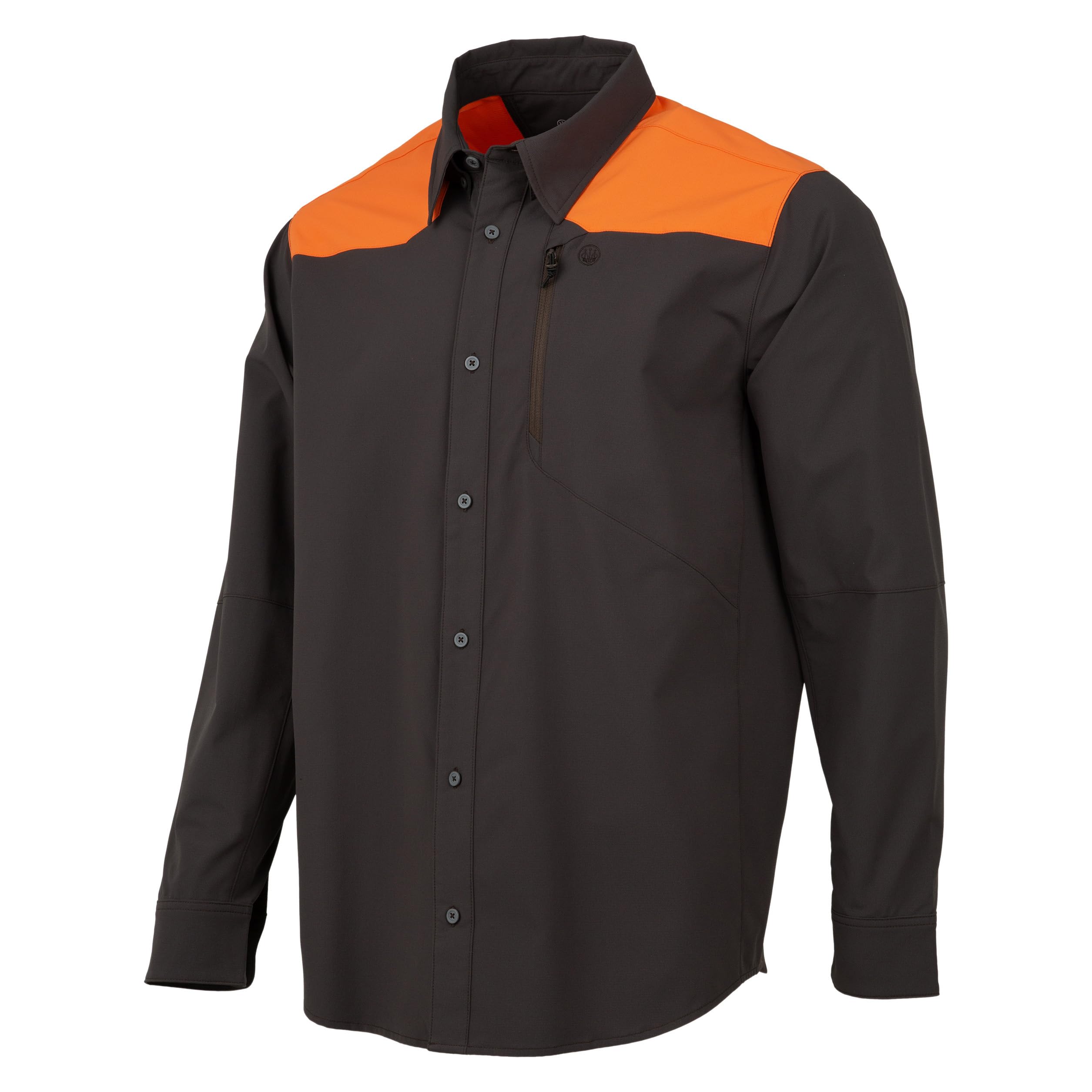 TECH SHIRT FOR MEN - The BERETTA Men's Ozark Tech Shirt is a purpose-built garment designed for rugged outdoor use, combining performance-driven materials with thoughtful design to meet the demands of hunting, hiking, or everyday fieldwear REAR CAPE VENT - The rear cape vent provides breathability and airflow, especially important when worn during high-movement activities like upland bird hunting; combined with the field shirt's lightweight construction, it helps maintain a cool, dry feel all day DESIGN & VISIBILITY - This hunting shirt makes a statement with its classic field body and high-visibility blaze orange accents across the shoulders and upper back; orange panels enhance visibility during hunting trips or outdoor activities in wooded or brush-covered terrain FUNCTIONAL SHIRT - The BERETTA Men's Ozark Tech Shirt features an athletic yet relaxed fit; a zippered chest pocket offers secure storage for small essentials like a license, map, or key, while the full front button closure is reinforced with durable buttons and strong seams for added reliability TECHNICAL FIELD SHIRT - Adjustable cuff buttons let you customize the sleeve fit to match changing weather or activity levels, making this technical shirt as versatile as it is rugged; clean lines and minimal branding give it a professional, utility-focused look The BERETTA Men's Ozark Tech Shirt is a high-performance field shirt engineered for the demands of serious outdoorsmen.