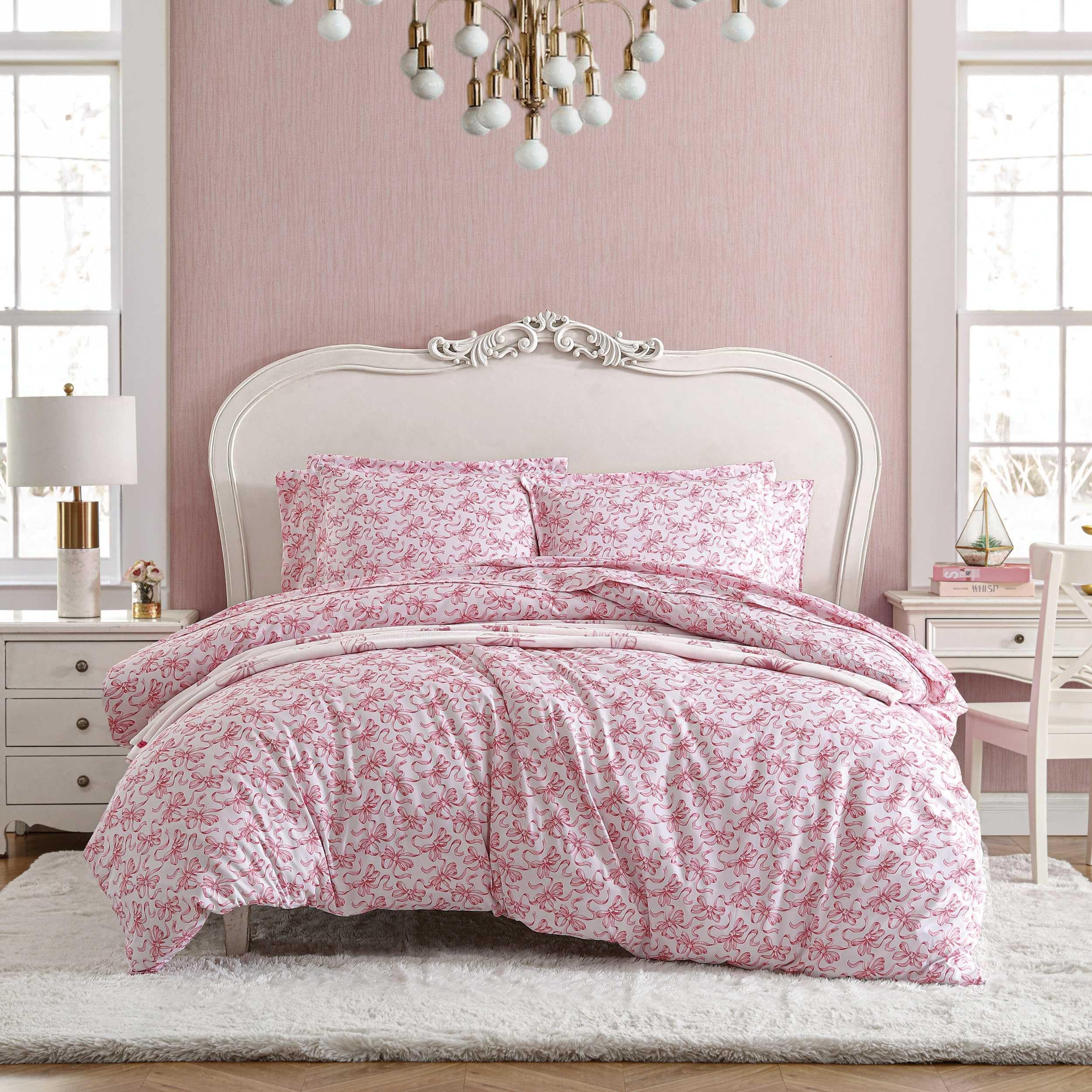 100% Polyester BETSEY JOHNSON HOME: Boldly designed bedding collections inspired by Betsey Johnson's iconic and whimsical style. Our products blend vibrant patterns with luxurious comfort, adding a touch of fun and creativity to your living space. Transform your bedroom with our unique and expressive pieces that bring color and joy into your home every day. FEATURES: The Betsey Johnson Ballet Bows duvet cover set features a sweet and pretty intertwined pattern of pink bows tied together on a light pink ground; Super soft hand feel constructed in microfiber, lightweight and versatile for year round use; Complete your bedding with any Betsey Johnson printed sheet set SET INCLUDES: One duvet cover and one standard sham; Twin Duvet Dimensions: 68"x 88", Standard Sham Dimensions: 20"x 26" CARE: To get the most of your Betsey Johnson Duvet Cover Set, machine wash cold and tumble dry low. Remove promptly to avoid wrinkles. CERTIFICATIONS: STANDARD 100 by OEKO-TEX Certified