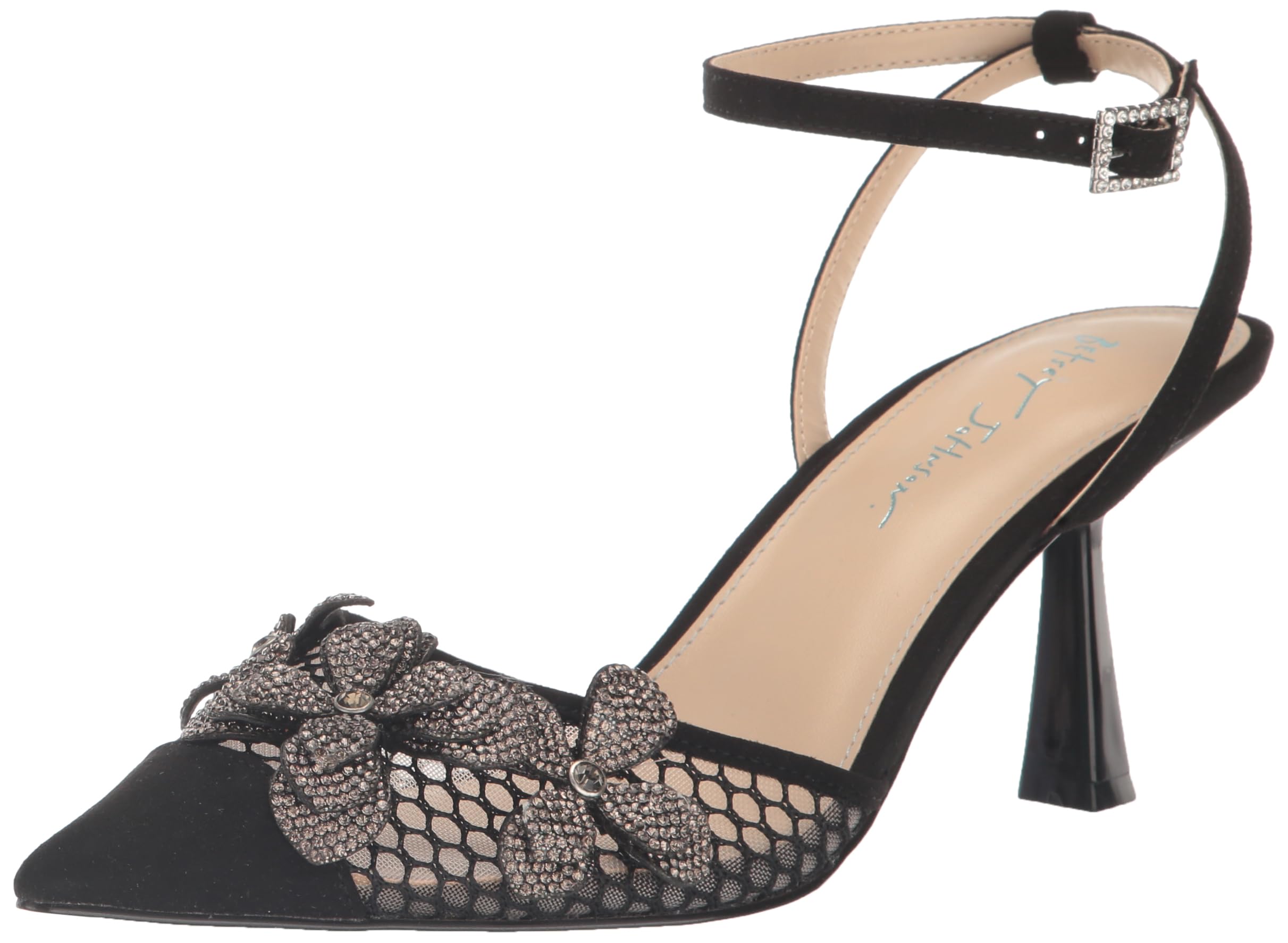 Betsey Johnson Womens Low sculpted heel pump 18 dimensional flowers on front Buckle closure on ankle strap Mesh and fishnet fabrics on toe