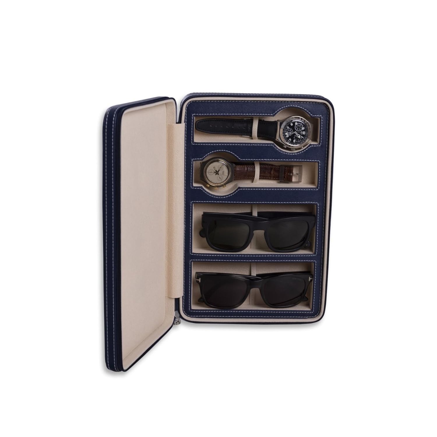 Versatile Watch and Sunglass Organizer: Keep your daily essentials together in one refined travel case instead of juggling separate pouches. The Francis case in blue leather opens like a book, revealing a neatly arranged interior for both timepieces and eyewear. Its slim, structured shape slides easily into a carry-on, briefcase or weekender while still offering real protection in transit. Make It Personal: Add initials, a monogram or a short name to the smooth blue leather exterior to create a case that feels custom-made. The precise laser branding stands out just enough against the rich color, giving the piece a signature look that’s easy to spot in your luggage. Personalization turns this into something you’ll reach for trip after trip, not just another travel accessory. Smart Interior Layout: Inside, two form-fit watch cutouts and two shaped sunglasses bays keep each item in its own secure place. Soft, scratch-resistant velour lining cushions bracelets, straps and lenses, helping to guard against scuffs as you move through your day. Whether you’re switching between dress and sport watches or carrying backup shades, everything is visible and ready at a glance. Durable Leather Shell & Easy Upkeep: Crafted from sturdy blue leather with contrast stitching, the case balances a polished appearance with practical durability. A smooth zip-around closure keeps the contents enclosed and dust-free, while the lightweight 1.35 lb build and 11.25" x 7.25" x 2.25" profile make it easy to pack. To care for it, simply wipe the exterior with a soft, dry cloth and avoid harsh cleaners or prolonged moisture so the leather and lining stay looking fresh. Occasion-Ready Gift Idea: With space for two watches and two pairs of sunglasses, plus a personalized exterior, this case is a natural gift for frequent flyers and style-conscious professionals. It works for birthdays, anniversaries, Father’s Day, graduations or client thank-yous when you want something both functional and elevated. For anyone who travels with options, it quickly becomes a trusted part of their packing ritual. For the stylish traveler, the Bey-Berk "Francis" Leather Travel Case provides a secure and elegant storage solution for your essentials. Crafted from luxury blue leather, this compact organizer display features form-fitting compartments to accommodate two watches and two pairs of sunglasses or eyeglasses. The soft, scratch-resistant velour lining keeps your watch accessories safe from damage, while the secure zipper closure ensures everything stays in place. With its sleek design, this portable travel organizer fits effortlessly into any suitcase, drawer cabinet, or carry-on bag, making it an ideal companion for travel set or everyday use. Whether for personal use or as a luxury gift, this versatile watch case is a must-have for those who appreciate both style and function. Dimensions: 11.25" x 7.25" x 2.25". Color: Blue