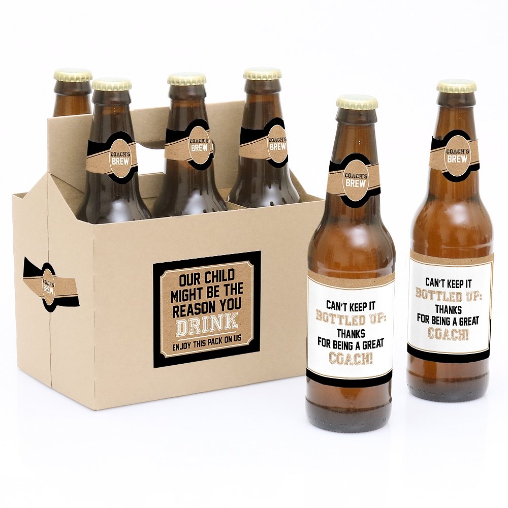Coach Appreciation Gift Beer Gift Set INCLUDES 6 beer bottle sticker labels & 6 bottle neck labels in the white, black and tan coach theme, as well as 1 six-pack carrier with 4 Coach Appreciation Gift stickers for decoration. Gifts For Coach Beer bottle stickers each SIZE 3.5" wide x 3" tall, perfect for standard beer bottles or similarly sized soda bottles; Beer collar neck labels measure 3.5" long x 1.5" wide at the center. Beer bottle labels are quick to apply and will give your coach gift a personal touch! HIGH QUALITY PARTY SUPPLIES: Coach Appreciation Gift beer bottle labels are professionally printed on a sticker paper with a glossy coating. They are waterproof and can be used on bottles that will be chilled, just apply prior to chilling. Use the beer kit as the perfect coach appreciation gift for an impressive, coordinated display. EASY TO USE: Prepare your beverage bottles by ensuring they are room temperature. Removing the original bottle label is not necessary but is preferred. Carefully peel one Coach Appreciation Gift sticker label from the backing and adhere to a bottle, starting at the edge and rolling to the opposite edge. Add the bottle neck label and place the completed bottle into the kraft paper carrier. Complete the beer gift kit by adding the remaining 4 stickers to the sides of the six-pack carrier. MADE IN THE USA: Coach Appreciation Gift - Gifts For Coach Beer Bottle Labels and Carrier is designed and manufactured at our Wisconsin facility using materials that are Made in the USA. Please Note: Beer in image is not included. Never know what to give as a gift to the Coach? Our Coach Appreciation - 6 Beer Bottle Labels with 1 Beer Carrier are the perfect gift for the adult or bring to a party. This set comes with a craft paper carrier and with 6 soda or beer bottle labels that are printed on sticker paper that is waterproof. Apply labels to room temperature bottles. Apply beer bottle labels either after removing original label for best results or put over existing labels if you choose. Chill after you are done applying labels. For the two larger labels that are left over apply to the front and back of paper carrier. Use the two smaller ones to put on each end of the paper carrier to give you the completed look. (Beer in image is obviously NOT included).