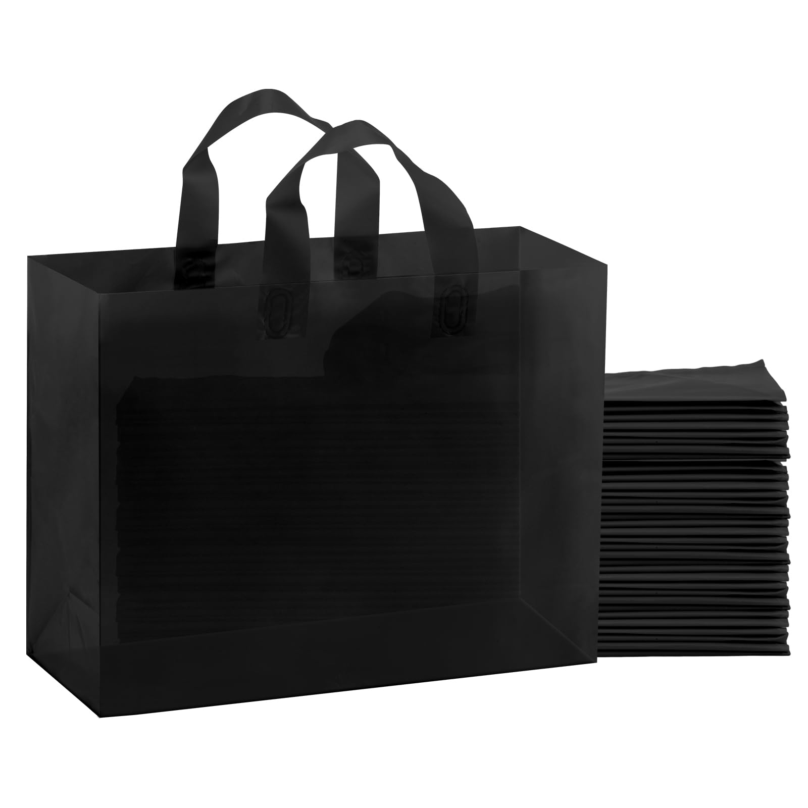 Include:This shopping bag measures 16x6x12 inches, you’ll receive 50 pack black gift bags with cardboard at the bottom,Wherever you go, you'll have a bag to carry and store your merchandise in! High-quality materials and reusable:This shopping bag Made with high quality frosted polyethylene plastic ,these plastic bags are water-resistant and can be reused Convenient use:Our shopping bags with soft strap handles are ,This pink gift bag is sturdy and durable with a cardboard bottom for easy loading and unloading,Each bag can hold several pounds each, making them perfect for both shopping Multifunctional: This shopping bag simple yet elegant and well-crafted design makes them perfect for use as gift bags, goodie bags, event bags, takeout bags, merchandise bags for retail shoppers, or boutique bags. Service:You can contact us at your convinence. If you are not 100% satisfied with your purchase, you can return it for refund! Black Gift Bags