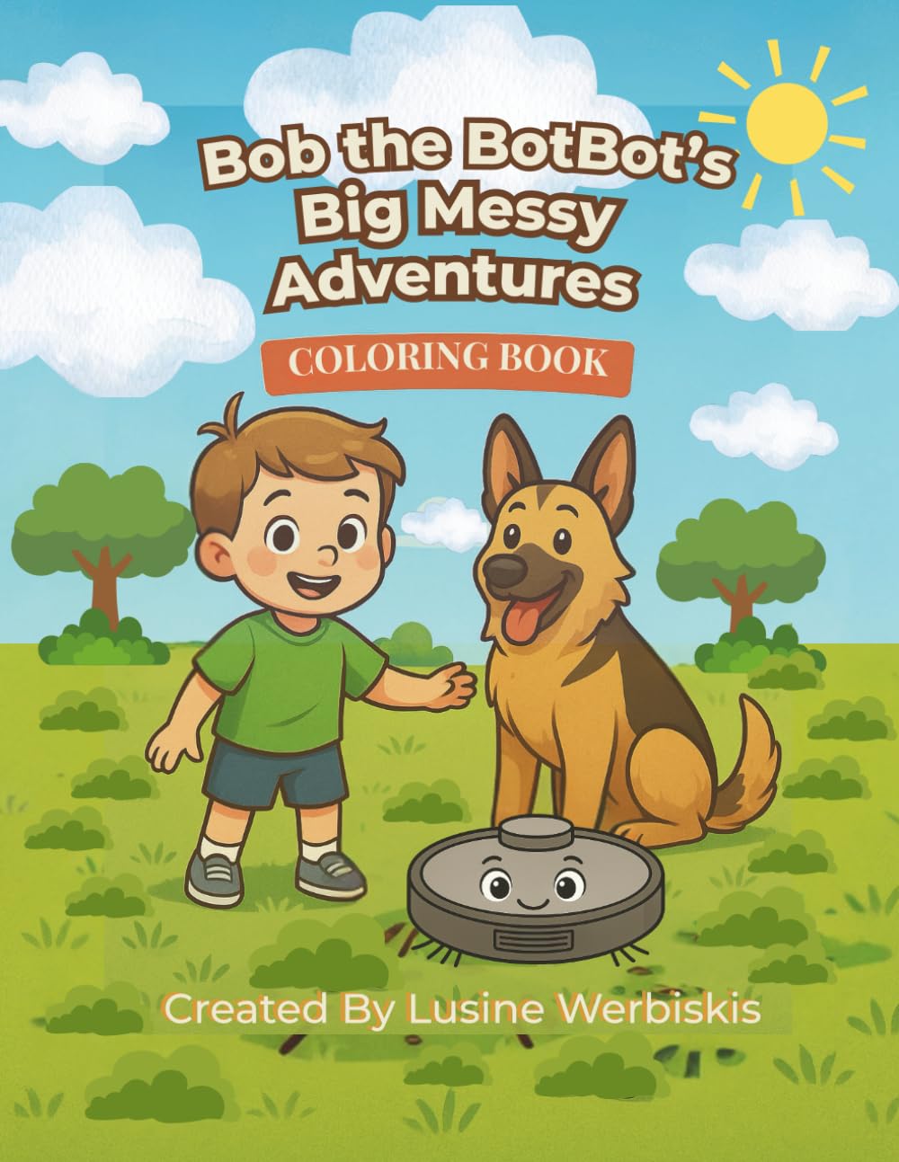 Get ready for giggles, messes, and a whole lot of coloring fun with Bob the BotBot’s Big Messy Adventures! Join Dominic , Lulu , Graf the German Shepherd , Mopz the mop-bot , and the lovable robot vacuum Bob the BotBot as they tackle crumbs, fur, and muddy paw prints — one page at a time! Designed especially for toddlers and preschoolers, this interactive coloring book turns everyday messes into adorable adventures that spark imagination and laughter. From sneaky snacks to fluffy furballs, each page encourages early creativity, fine motor skills, and storytelling — all while introducing the joy of clean-up in a fun, kid-friendly way.