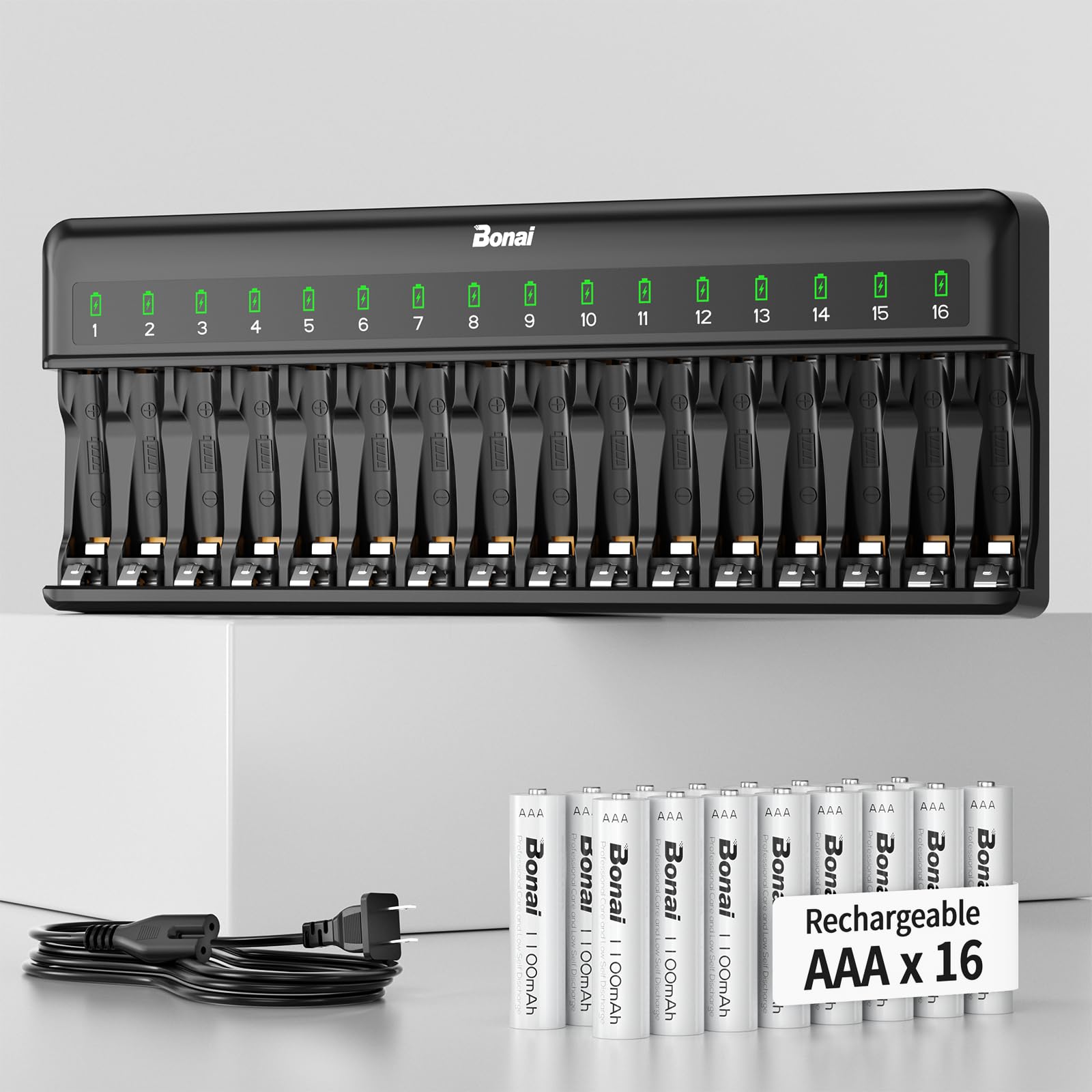 [Premium Battery and Charger Pair] - 16*1100mAh 1.2V Ni-MH AAA rechargeable batteries and large capacity battery charger, capable of charging up to 16 Ni-MH AA/AAA rechargeable batteries, comes with an AC wall plug. [Ready to Use & Holds Charge Longer] - Batteries aaa size pack are pre-charged and work right out of the box! They have low self-discharge and can stay powered for up to 1 years in storage—perfect for emergencies or last-minute needs. [Lasts WAY Longer Than Disposable Batteries] - One triple a battery can be recharged up to 1,200 times—saving you hundreds of dollars compared to buying disposable AAAs. Works like a champ in game controllers, flashlights, and smart home gadgets etc. [No need to pair batteries or wait for a full set] - Bonai 16-bay charger lets you charge 1, 5, or 16 Ni-MH AA/AAA rechargeable batteries at once, even mixing AA & AAA! Smart LED indicators (red=charging, green=fully charged, red flashing=wrong /defective /no battery ) make it hassle-free. [Advanced Safety Protection] - Built-in safeguards prevent overcharging, overheating, and short circuits. Works with 110V-240V outlets (no bulky adapter needed) and stays silent while charging—just plug in and go! Bonai Rechargeable AAA Batteries with Charger, 16 Bay Smart Fast Battery Charger with American AC Plug & 1100mAh High Capacity Pre-Charged Low Self-Discharge Leak Proof Triple A Batteries (16 Pack)